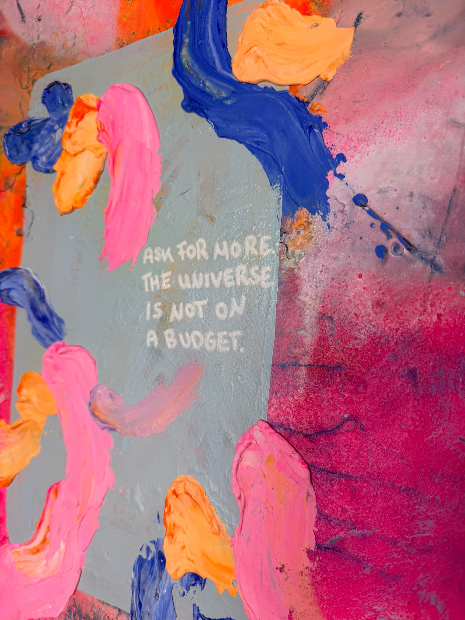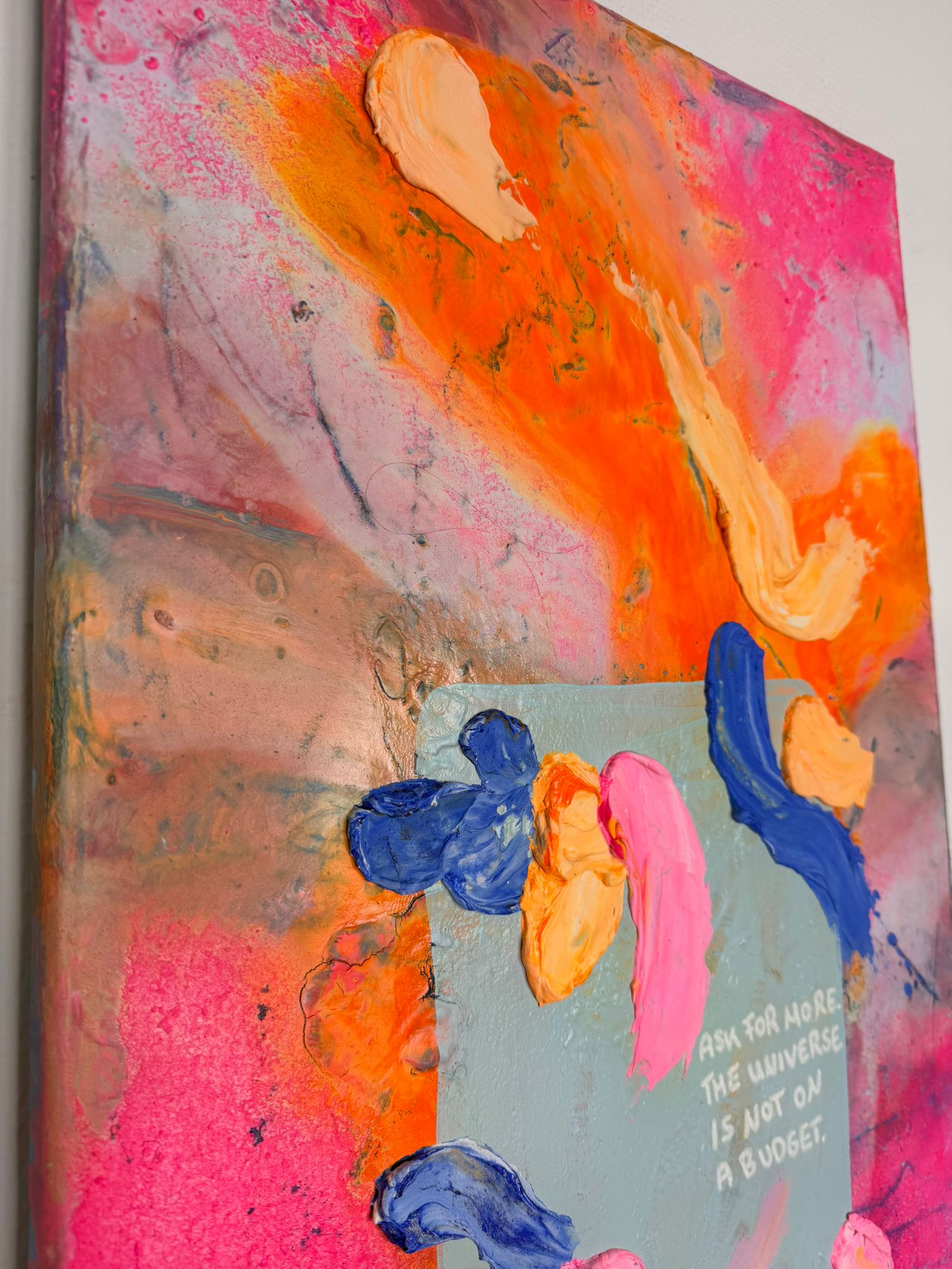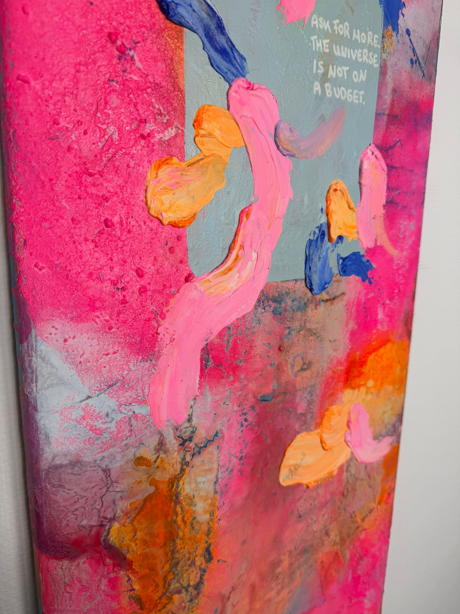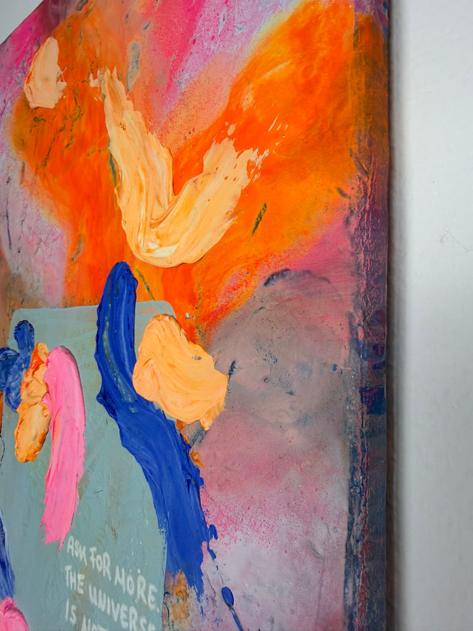 Die vertikale Komposition verstärkt das Gefühl von Bewegung und Wachstum. Kräftige Pink- und Orangetöne treffen auf kühle Blauakzente, die wie Gedanken oder innere Impulse durch das Bild fließen. Die Formen wirken frei und intuitiv – nicht festgelegt, sondern offen für Entwicklung. In der Mitte liegt eine subtile Botschaft, fast wie ein Flüstern: Erlaube dir, mehr zu erbitten.