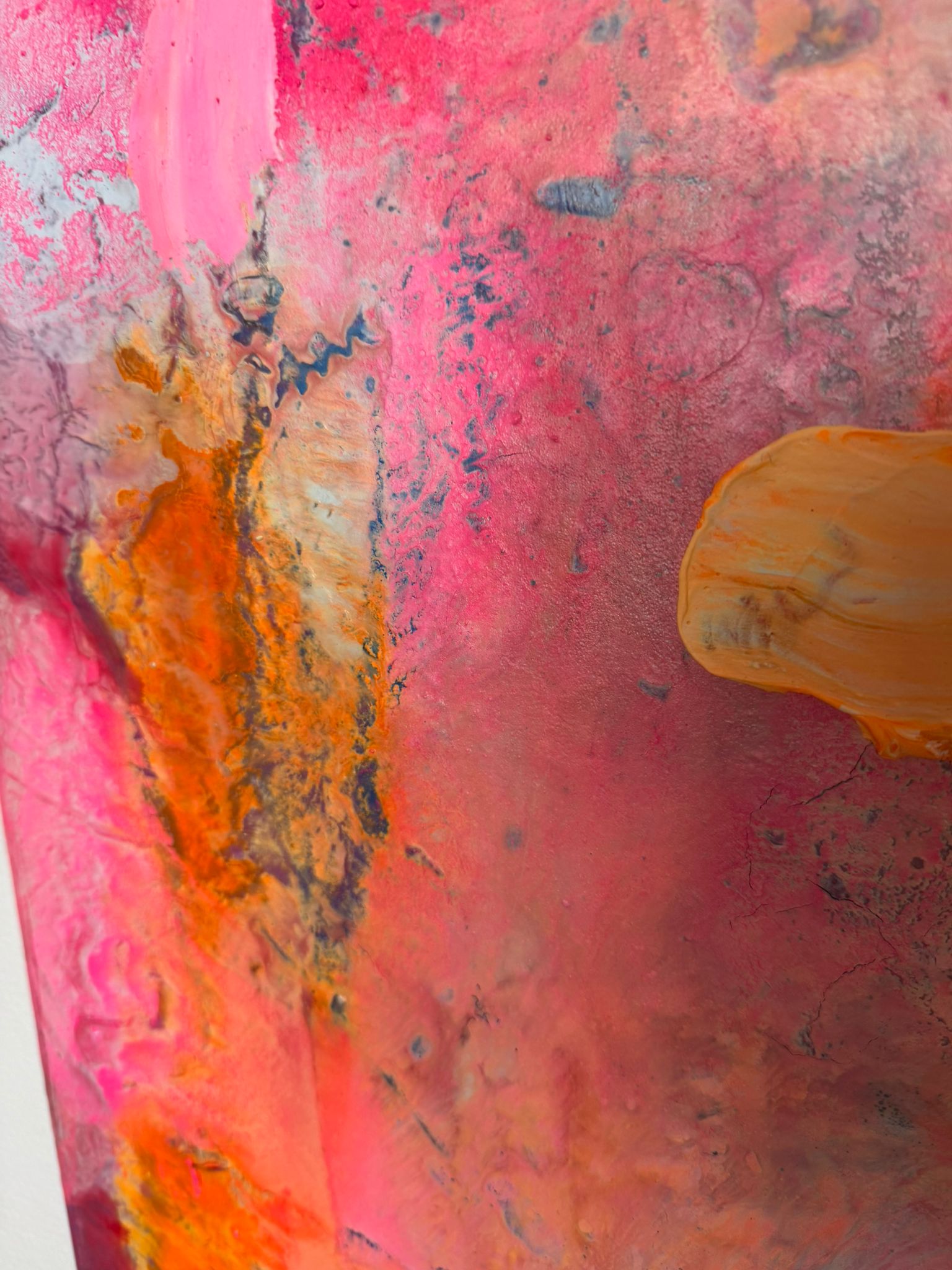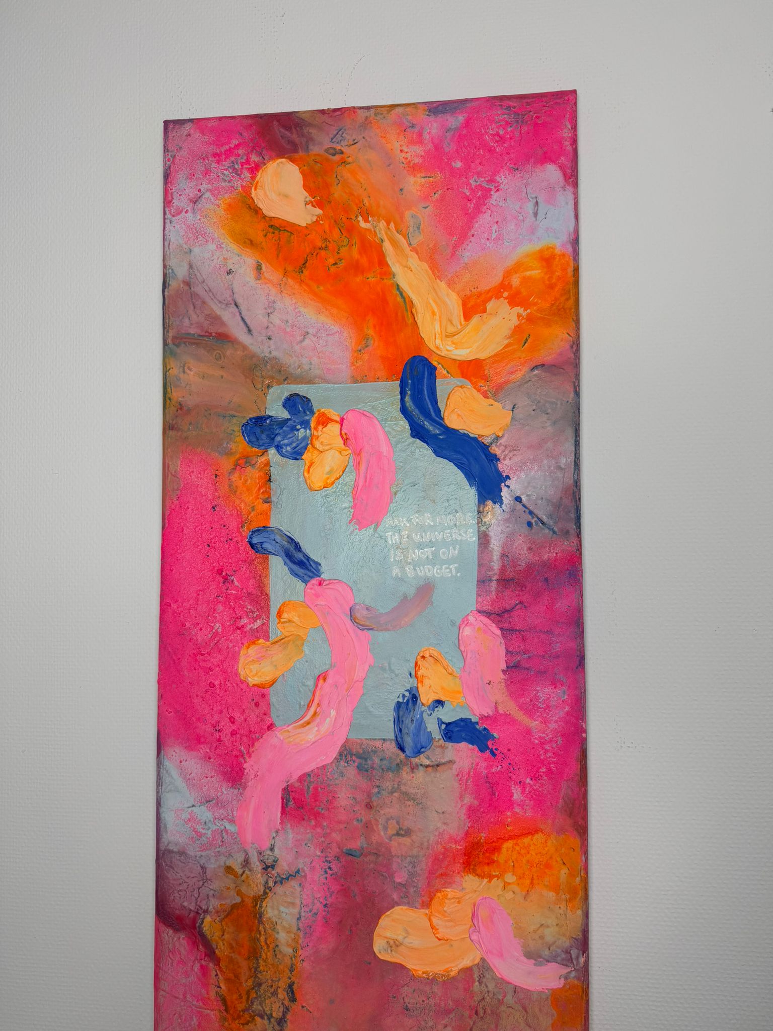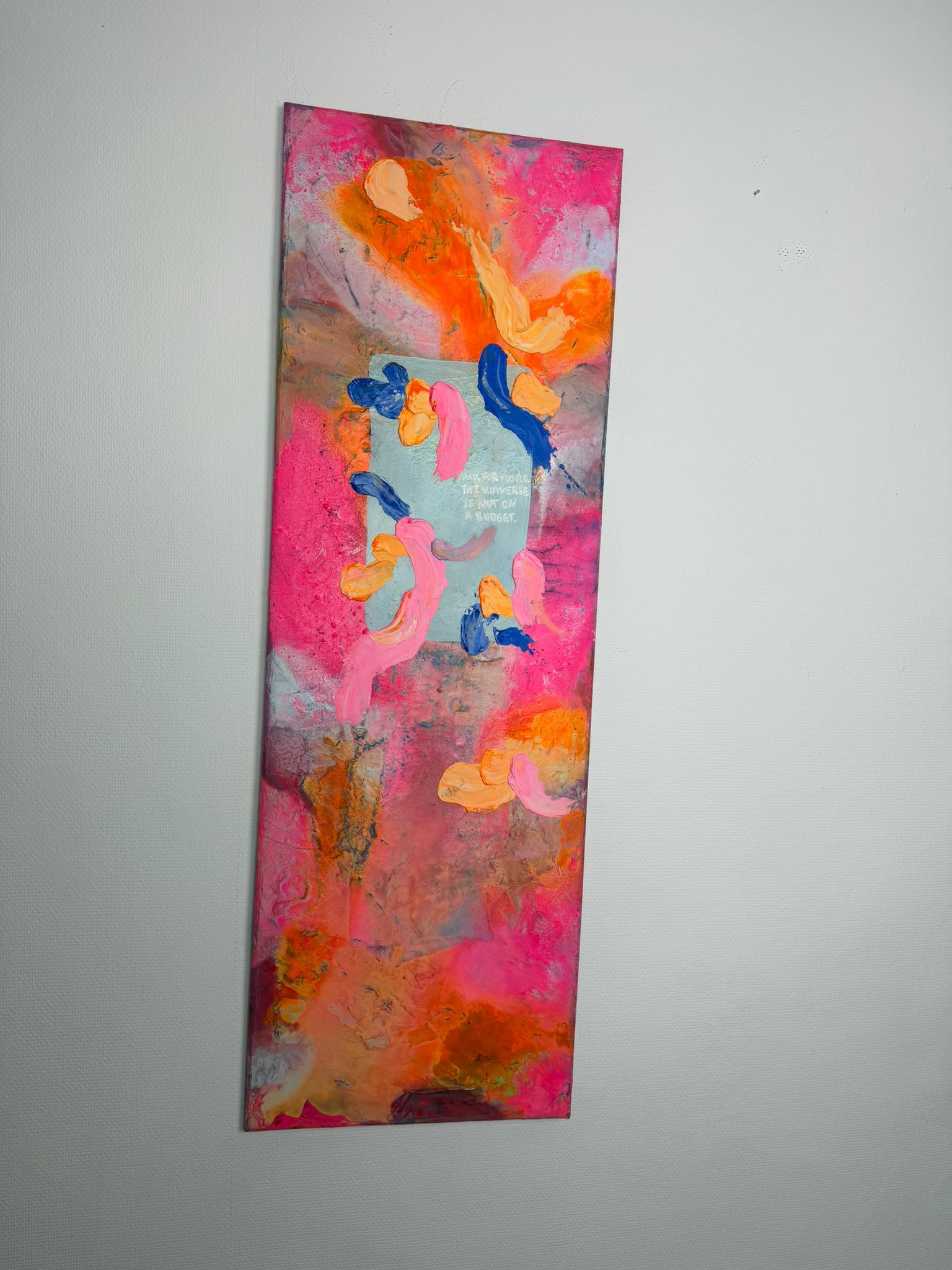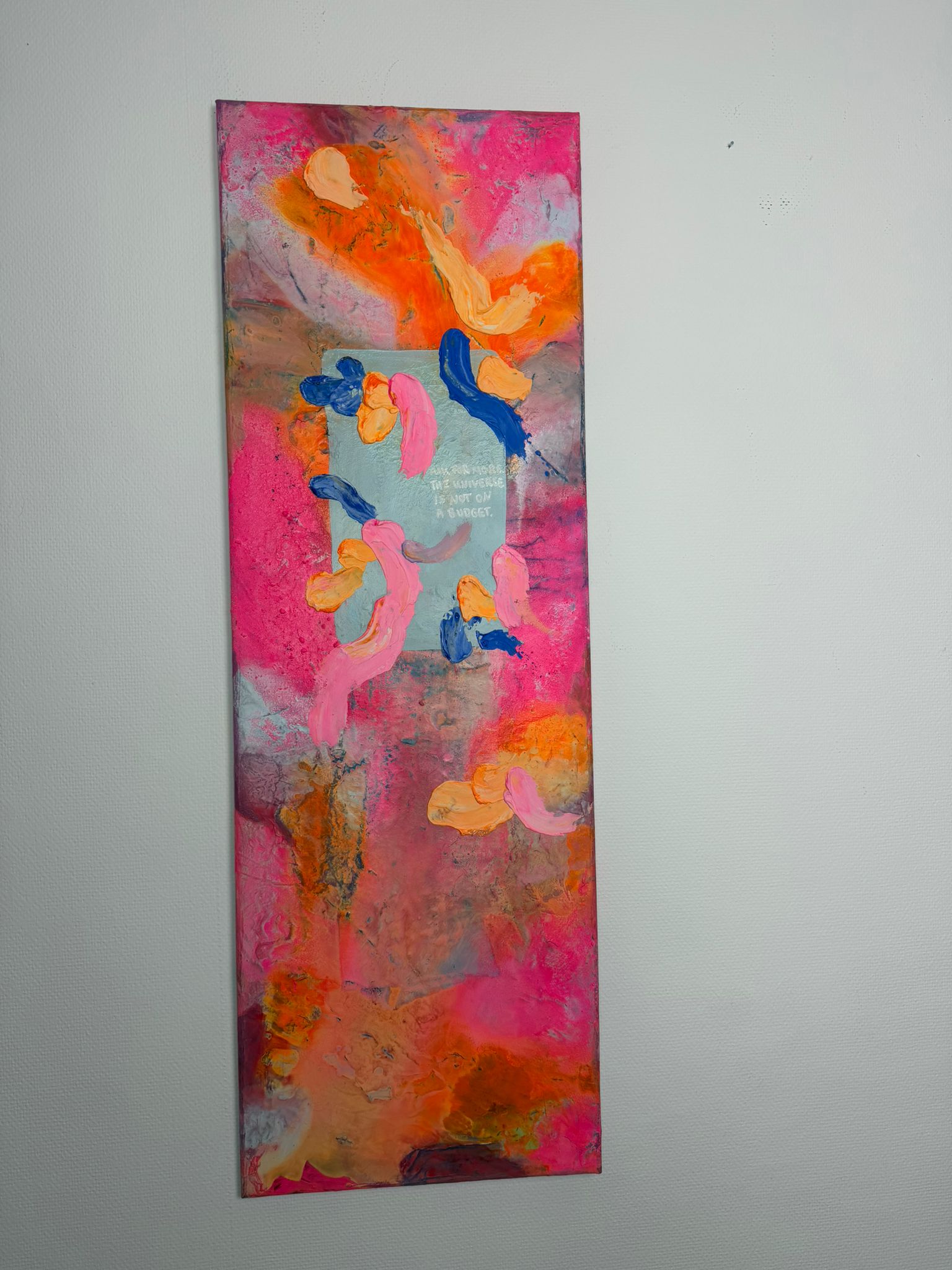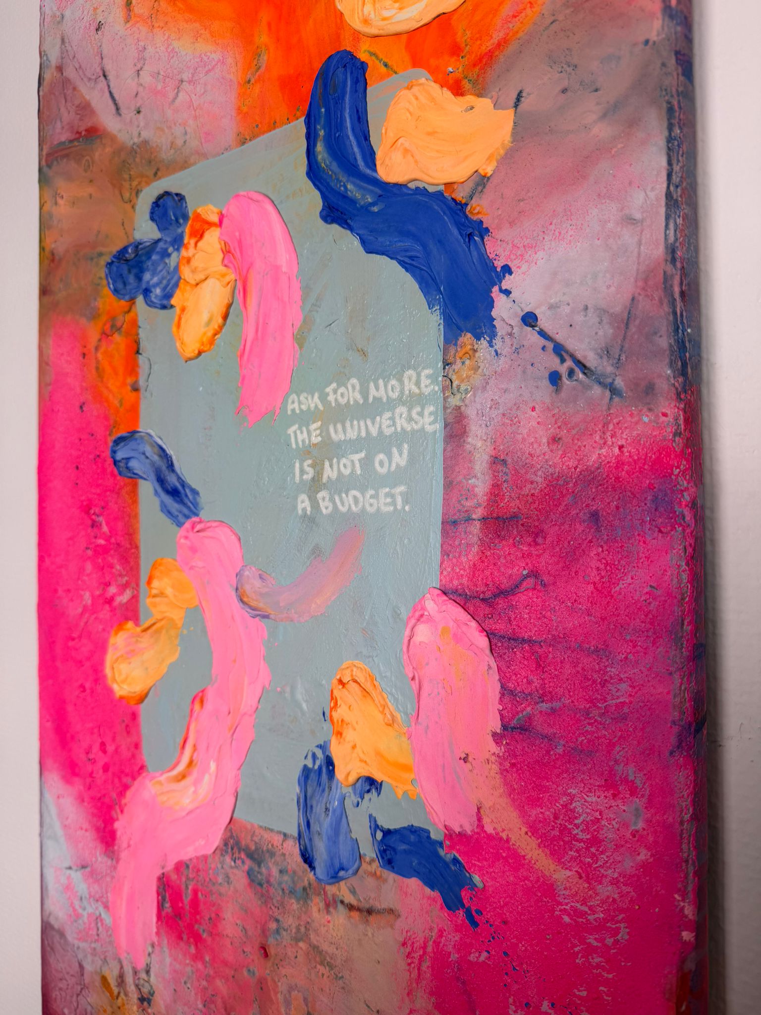 Die vertikale Komposition verstärkt das Gefühl von Bewegung und Wachstum. Kräftige Pink- und Orangetöne treffen auf kühle Blauakzente, die wie Gedanken oder innere Impulse durch das Bild fließen. Die Formen wirken frei und intuitiv – nicht festgelegt, sondern offen für Entwicklung. In der Mitte liegt eine subtile Botschaft, fast wie ein Flüstern: Erlaube dir, mehr zu erbitten.