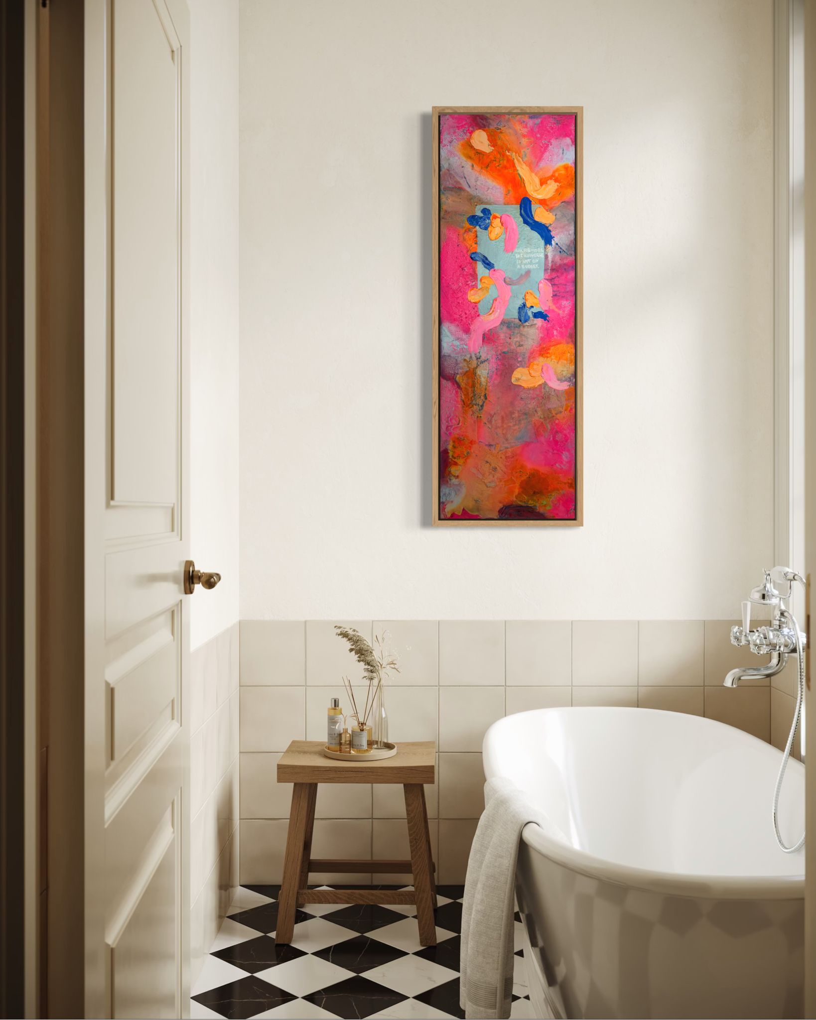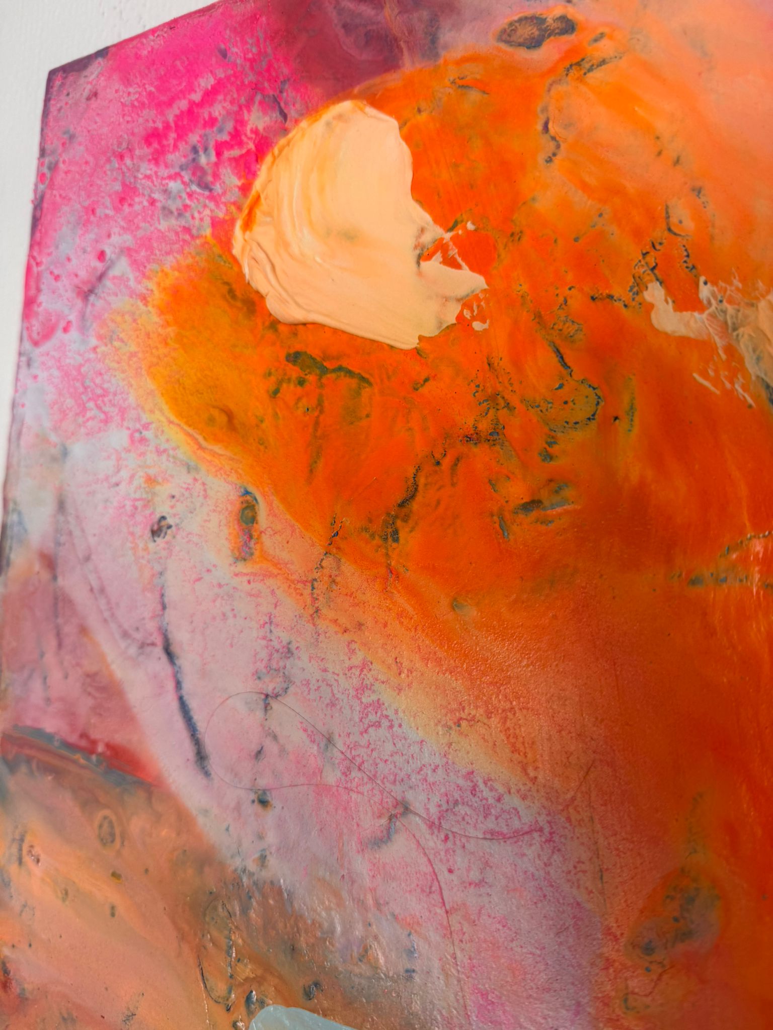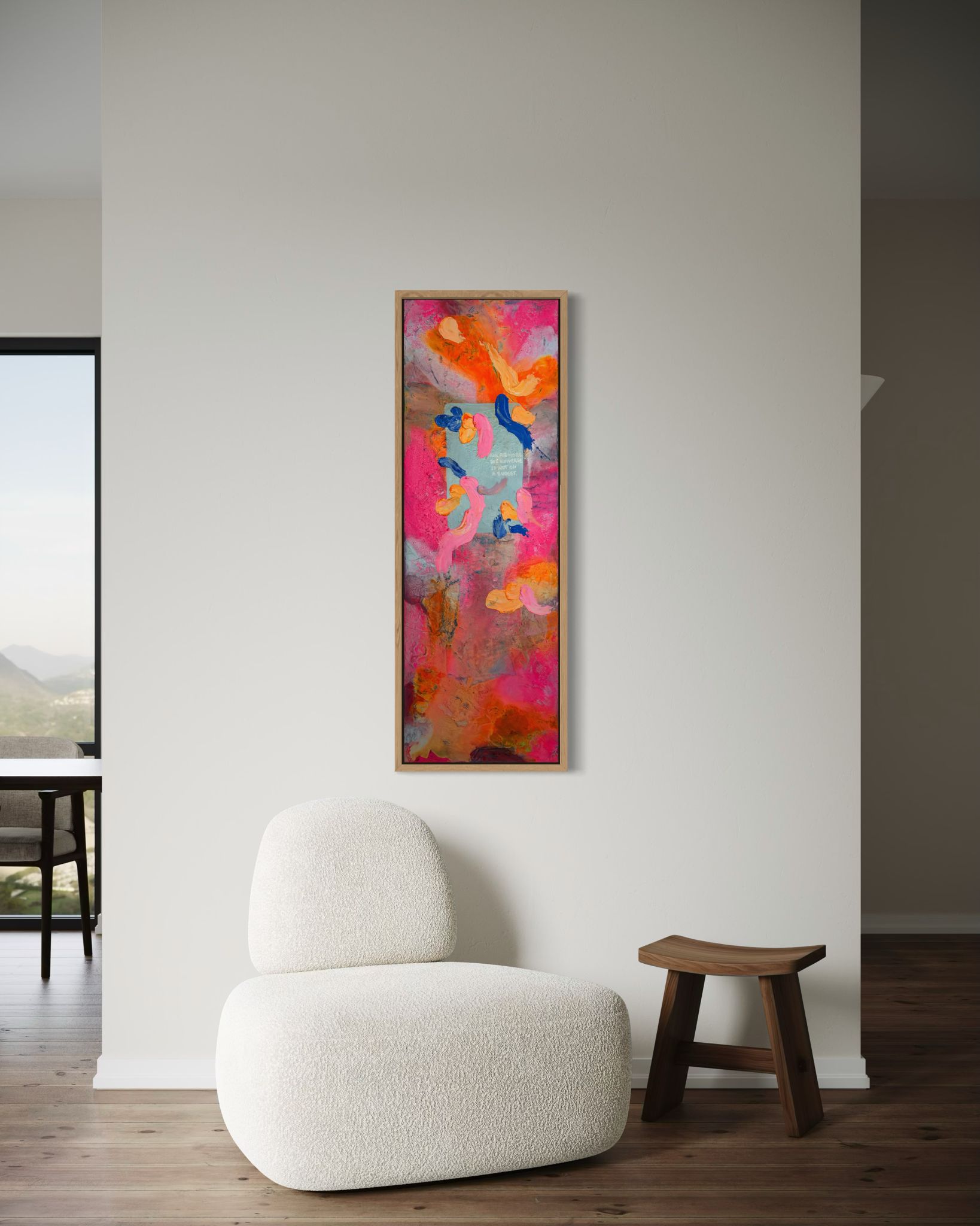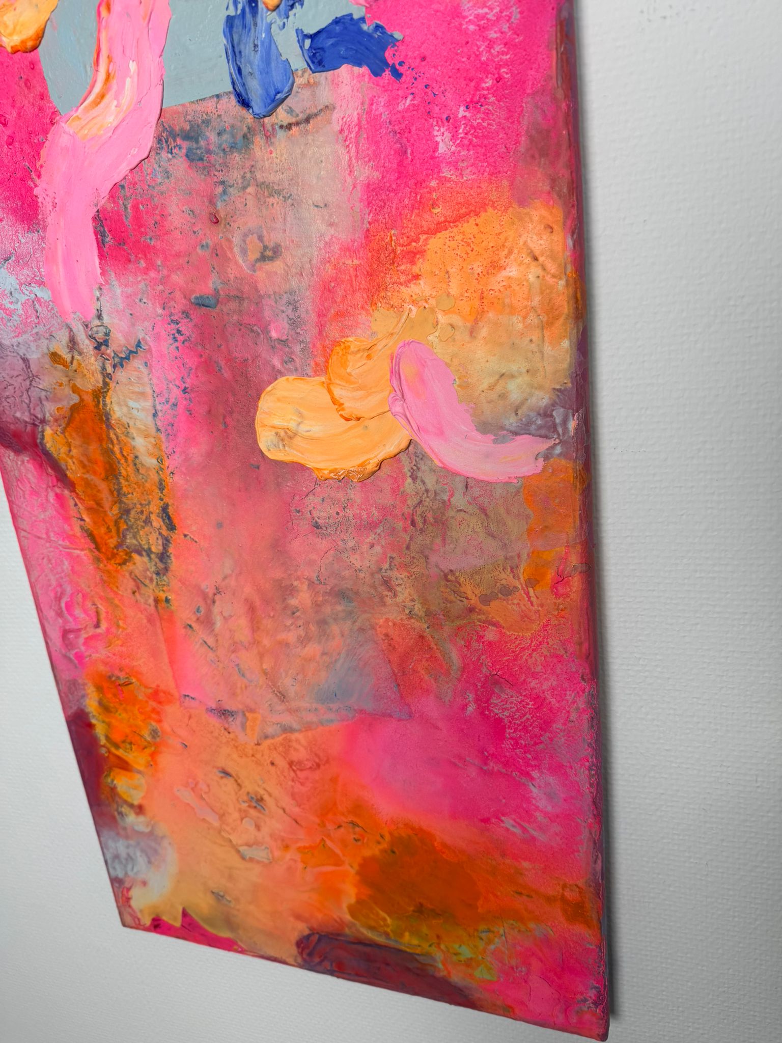 Die vertikale Komposition verstärkt das Gefühl von Bewegung und Wachstum. Kräftige Pink- und Orangetöne treffen auf kühle Blauakzente, die wie Gedanken oder innere Impulse durch das Bild fließen. Die Formen wirken frei und intuitiv – nicht festgelegt, sondern offen für Entwicklung. In der Mitte liegt eine subtile Botschaft, fast wie ein Flüstern: Erlaube dir, mehr zu erbitten.
