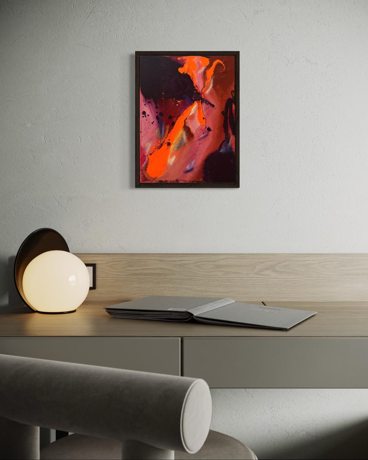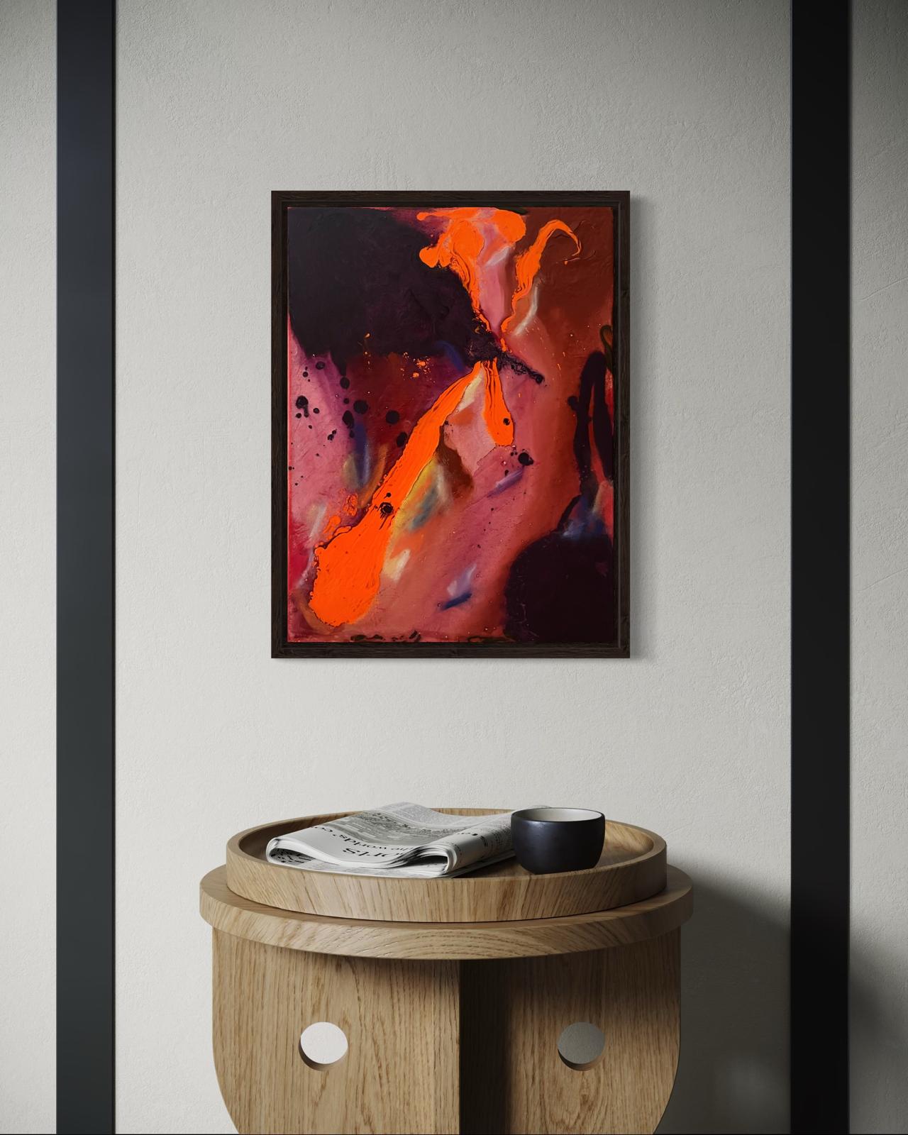 Mit explosiven Orangetönen, tiefem Violett und schattigem Rot erzählt dieses Gemälde von der Energie, die aus uns herausbrechen will – roh, kraftvoll, ungefiltert. Jeder Pinselstrich gleicht einem Impuls: ein innerer Ruf, der sich seinen Weg an die Oberfläche bahnt.