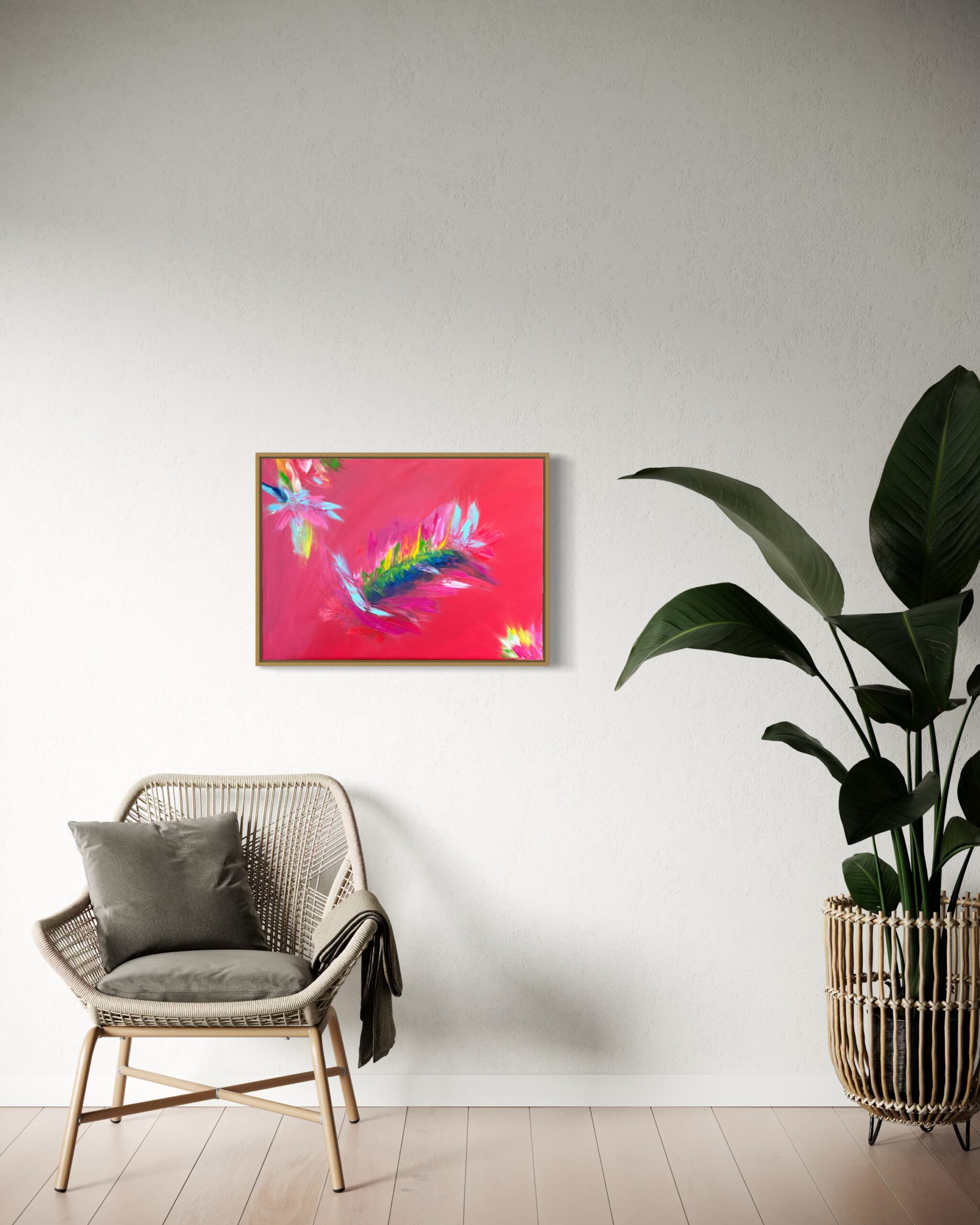 Das leuchtende Pink strahlt Power aus, während die kräftigen Akzente in Türkis, Grün, Gelb und Weiß wie energetische Impulse durch die Komposition tanzen. Die Formen wirken wie Blüten oder Lichtblitze – Symbol für Vitalität, Wiederaufstehen und neue Klarheit.
