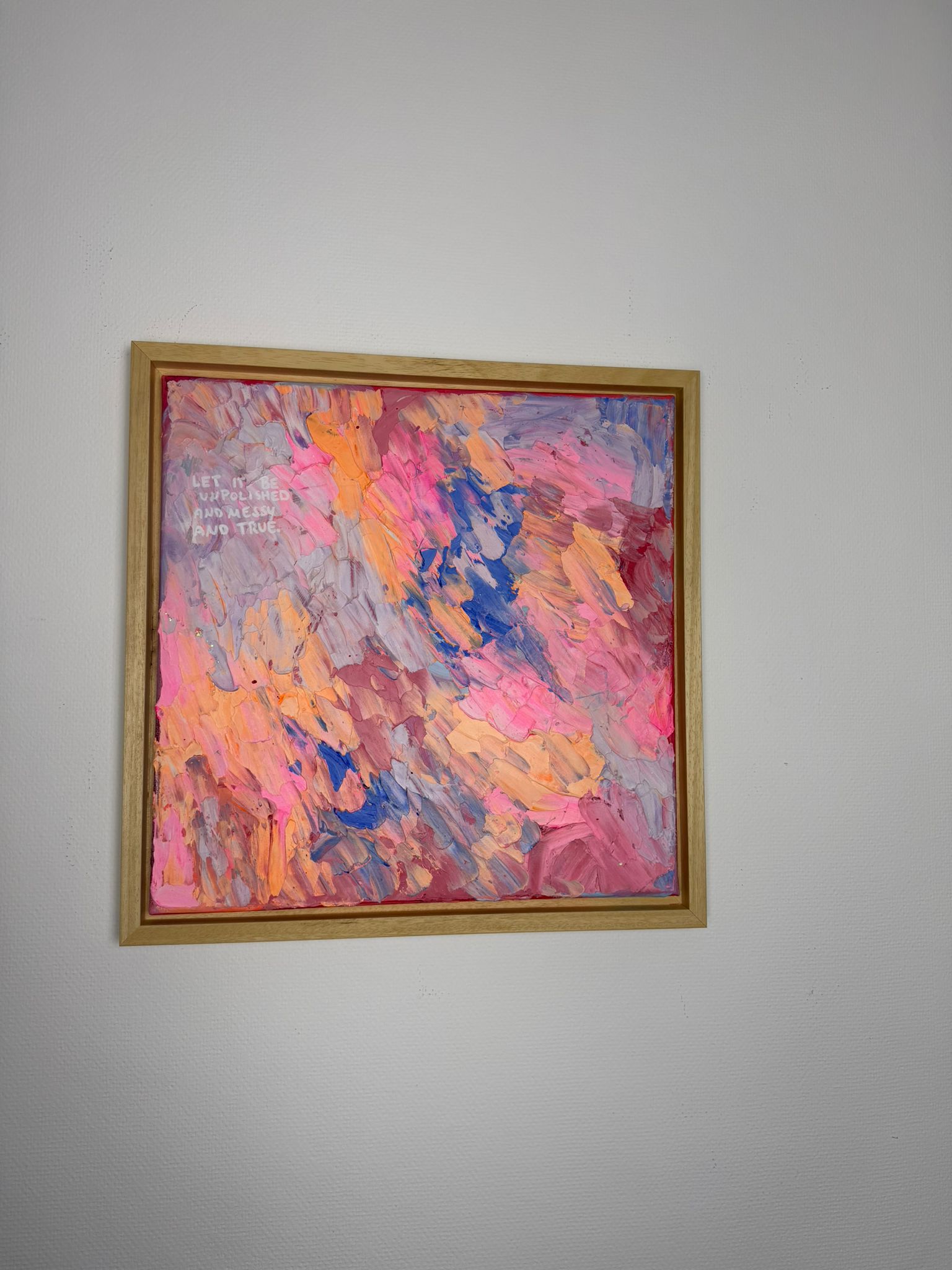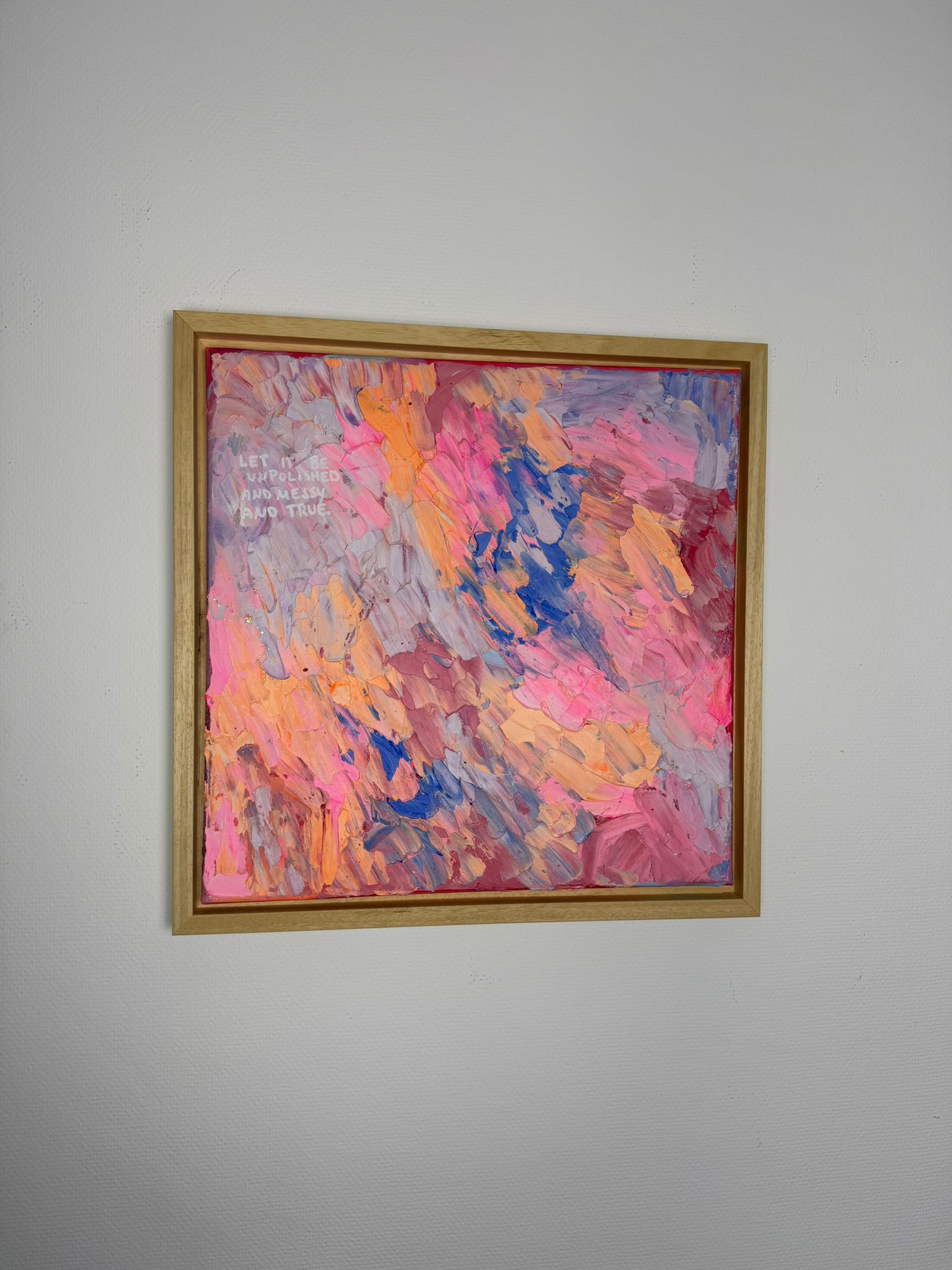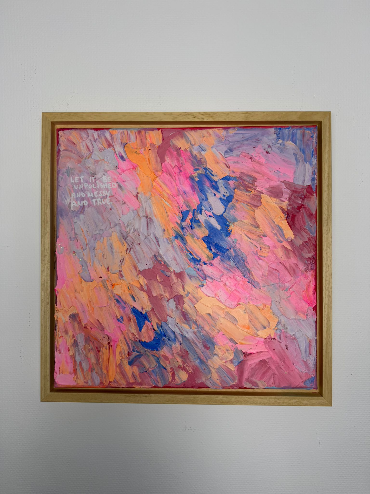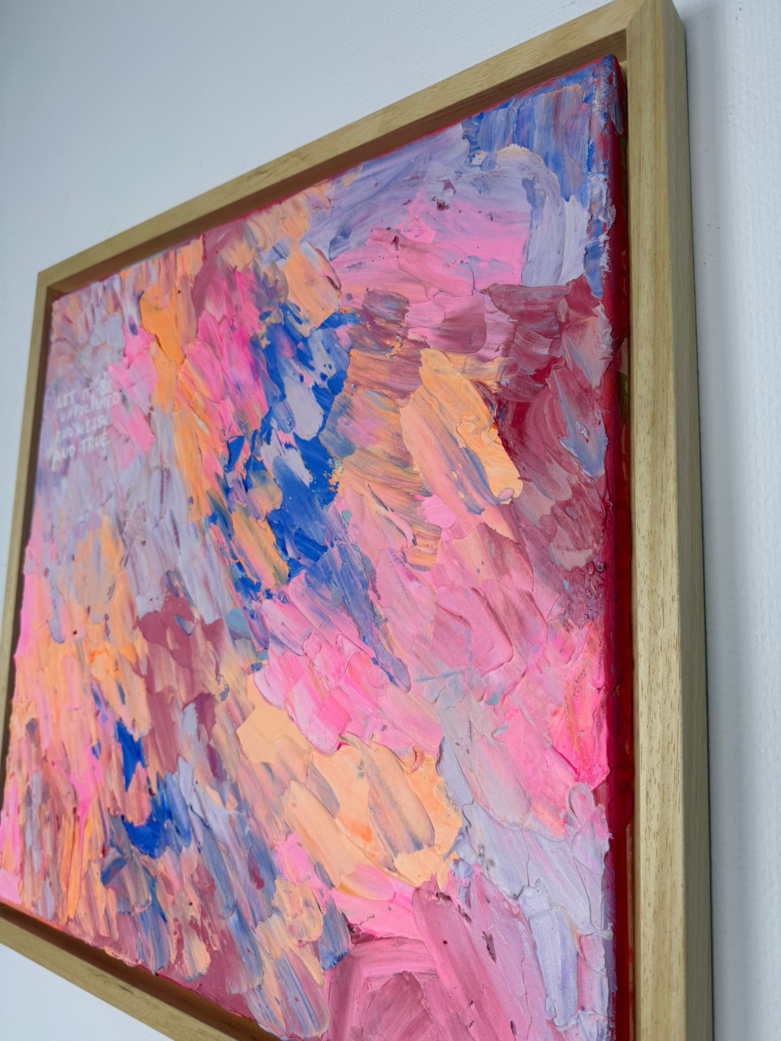 Dichte, expressive Pinselbewegungen in Rosa-, Apricot- und Blautönen überlagern sich wie Gedanken, Gefühle und gelebte Momente. Keine klare Ordnung – sondern ein lebendiger Rhythmus. Die Oberfläche wirkt roh, spontan und voller Energie. Die leise Botschaft im Bild erinnert daran: Wahrhaftigkeit entsteht nicht aus Perfektion, sondern aus Mut.