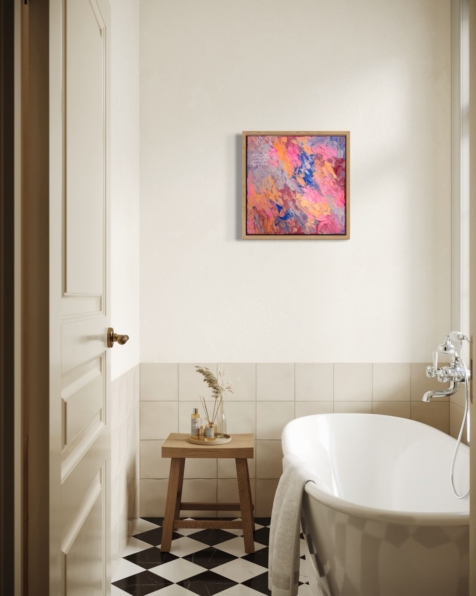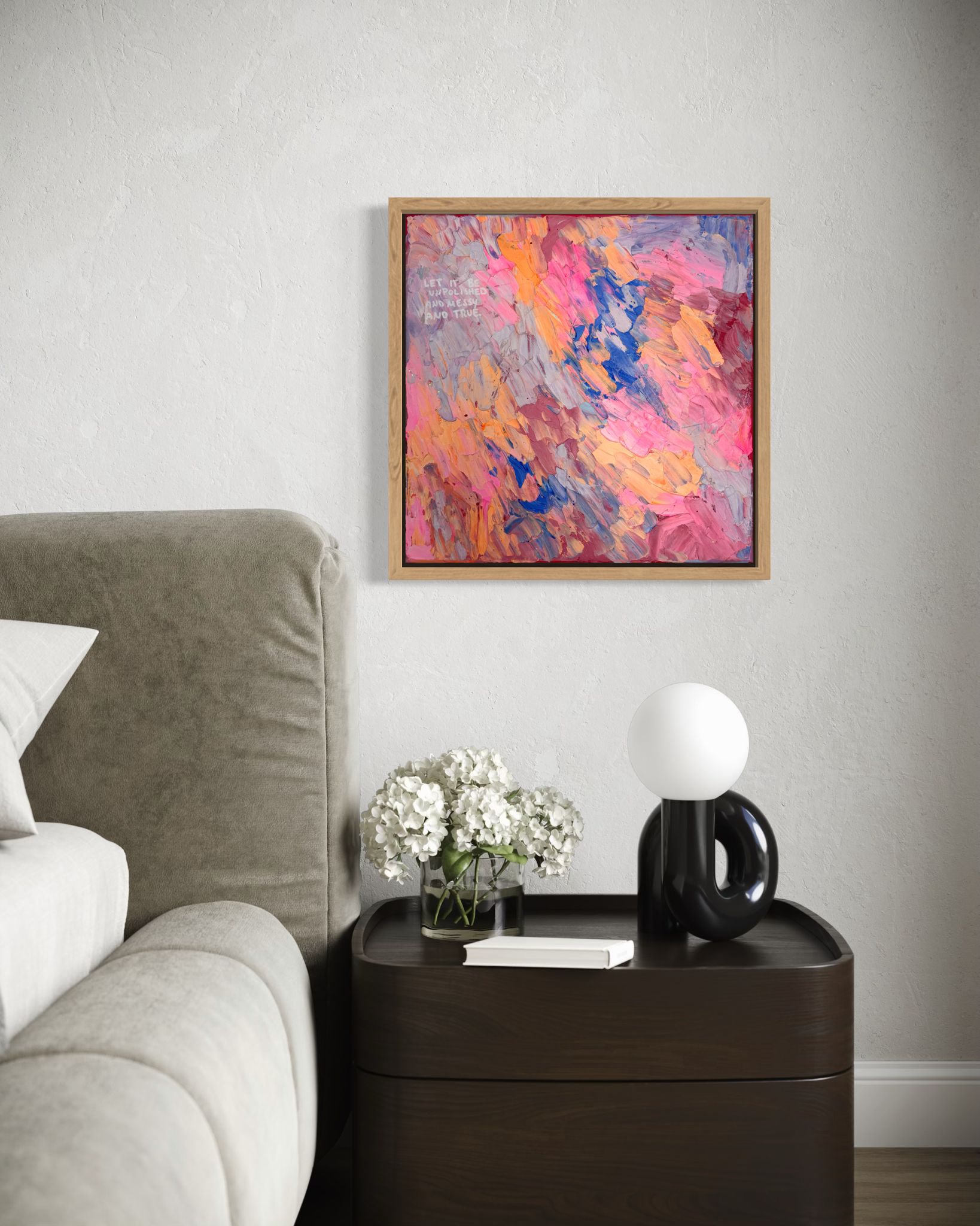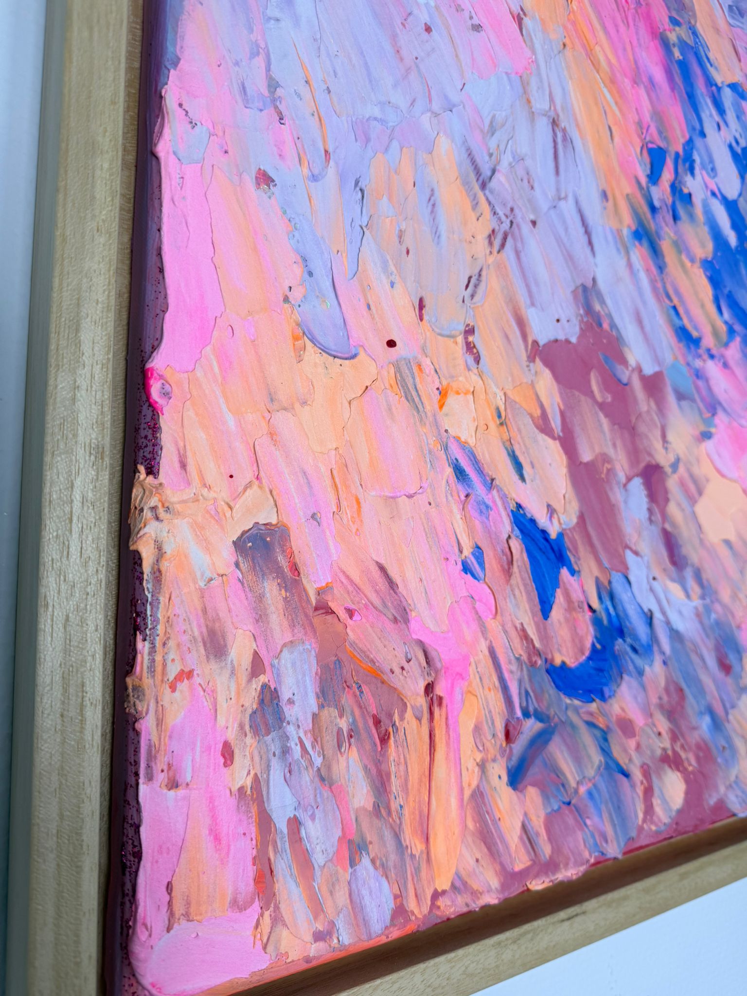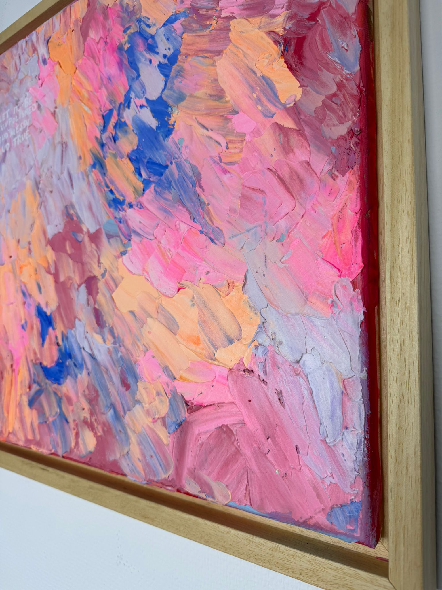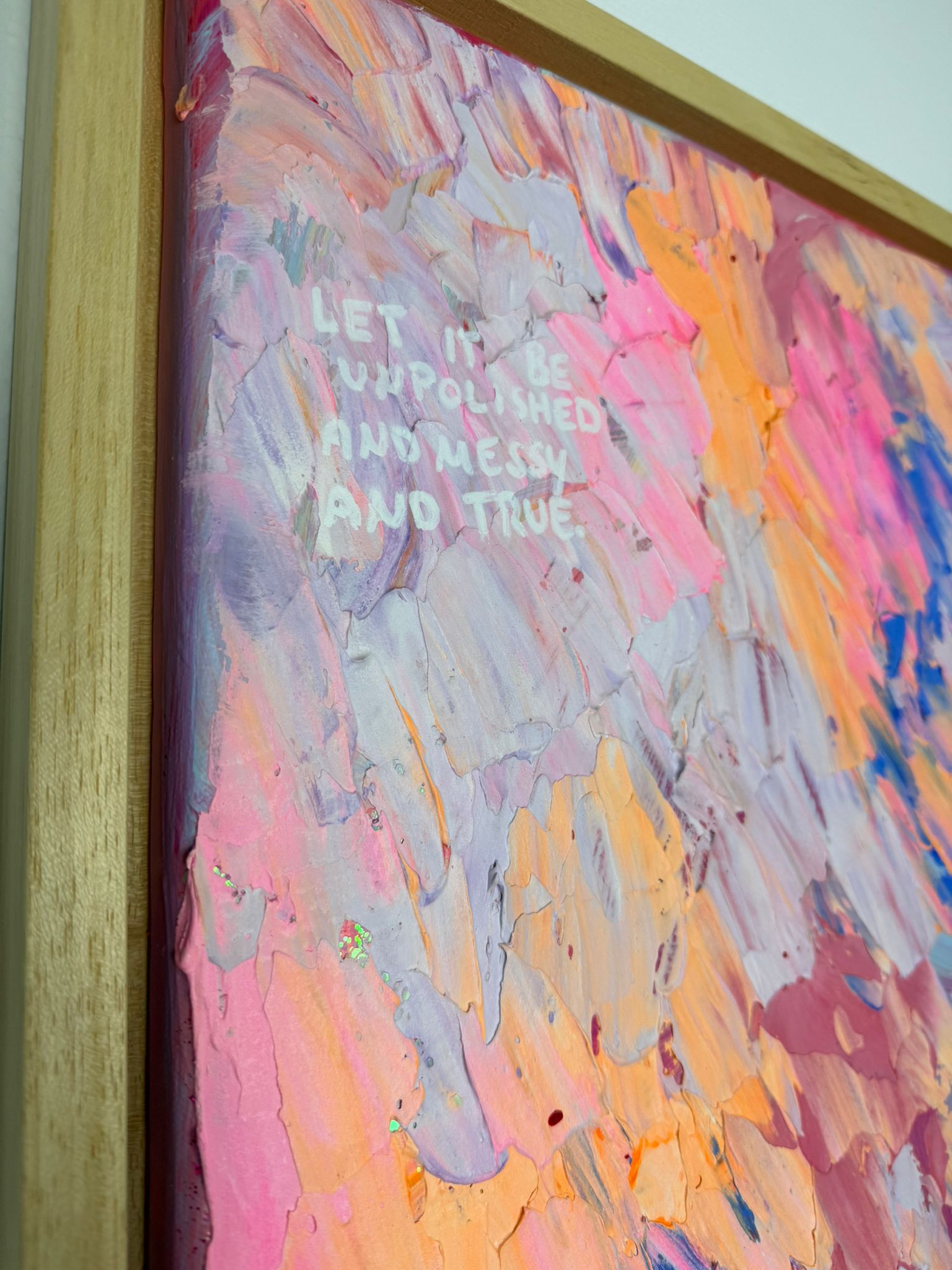 Dichte, expressive Pinselbewegungen in Rosa-, Apricot- und Blautönen überlagern sich wie Gedanken, Gefühle und gelebte Momente. Keine klare Ordnung – sondern ein lebendiger Rhythmus. Die Oberfläche wirkt roh, spontan und voller Energie. Die leise Botschaft im Bild erinnert daran: Wahrhaftigkeit entsteht nicht aus Perfektion, sondern aus Mut.