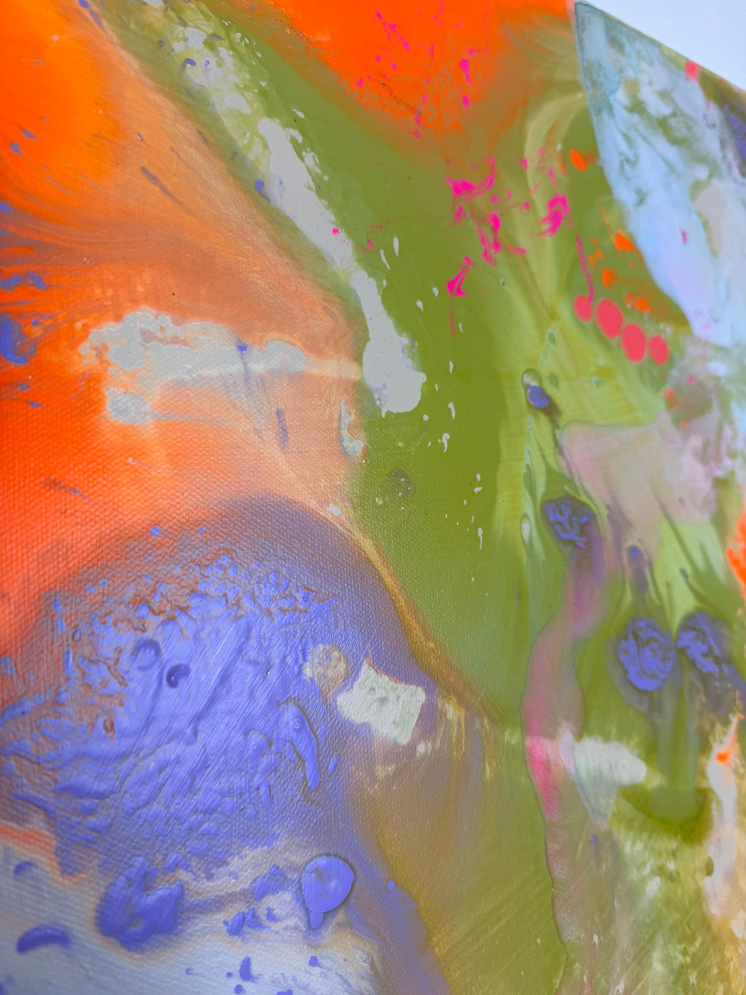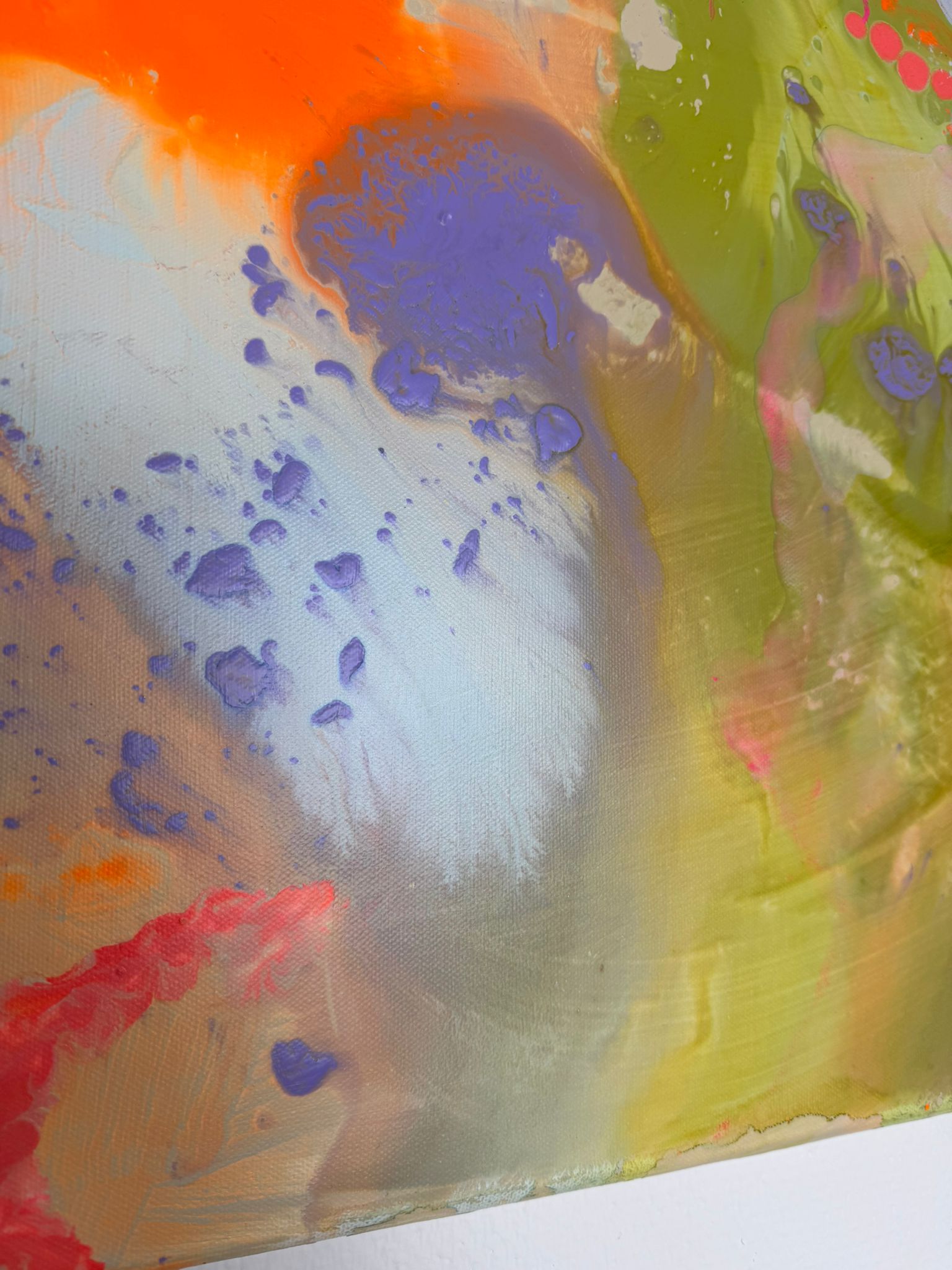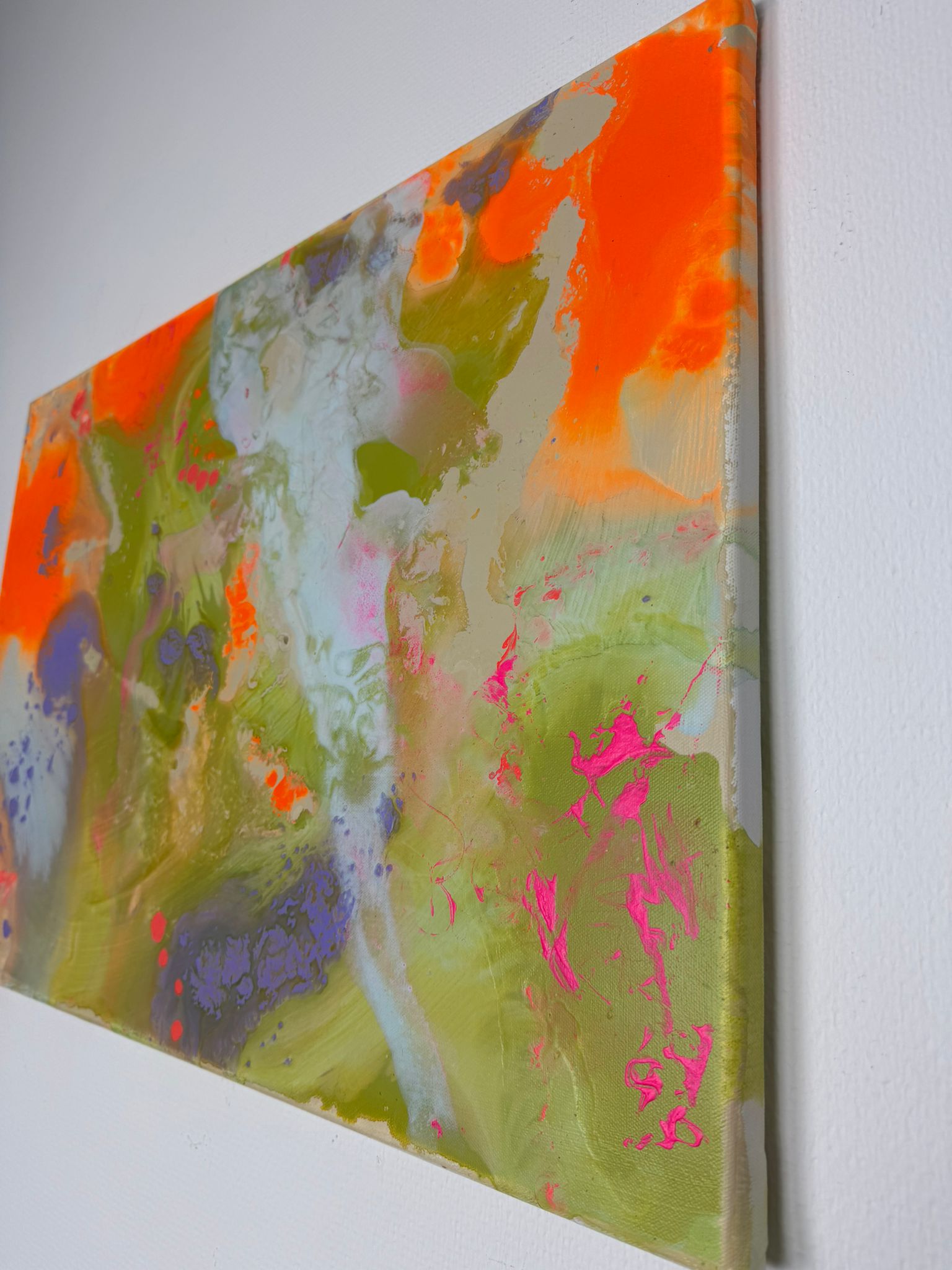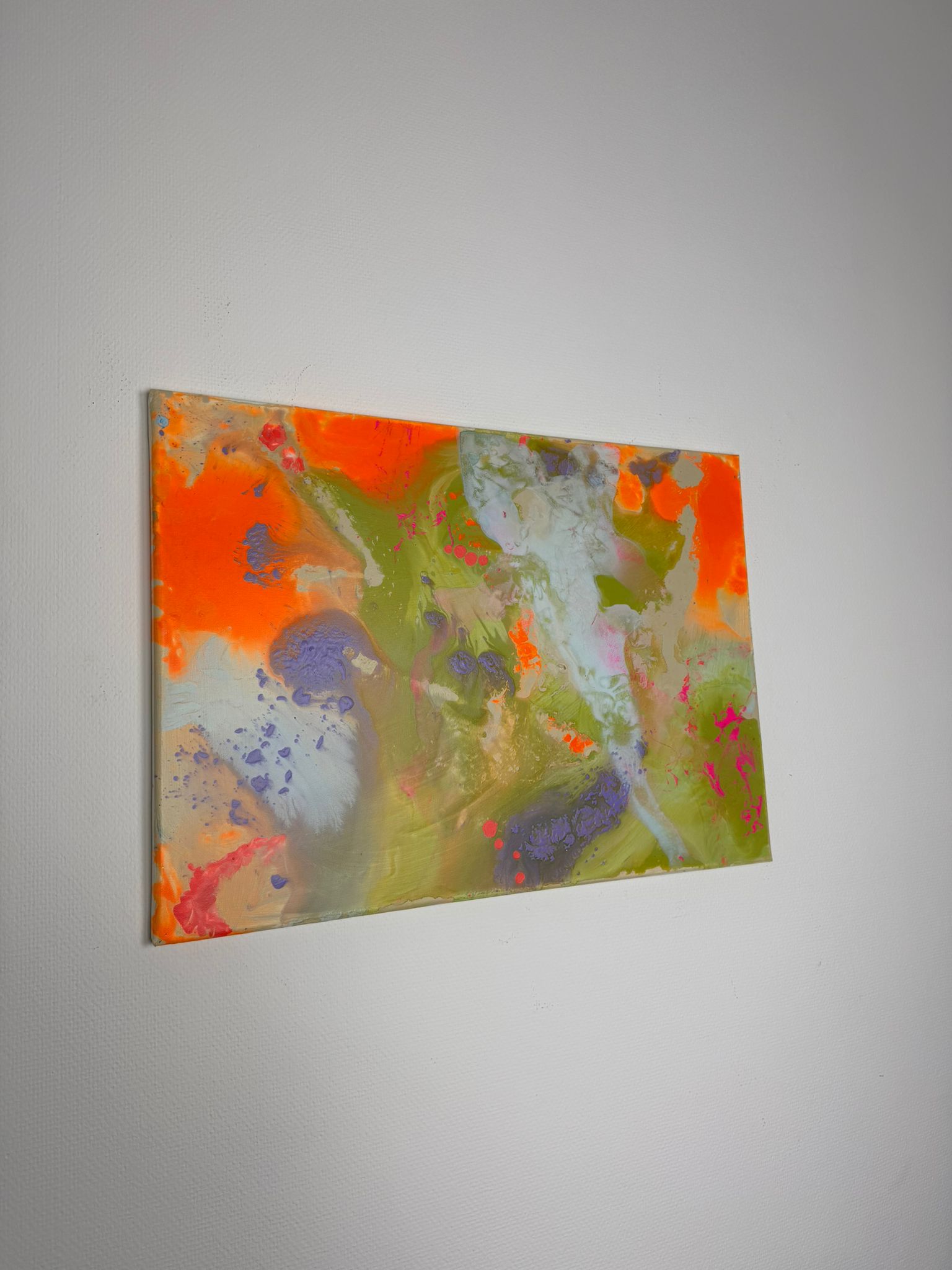 Leuchtende Orangetöne fließen über sanfte Grün- und Blauflächen und erzeugen eine Atmosphäre von Leichtigkeit und innerer Weite. Die Komposition wirkt wie ein innerer Zustand: ruhig, offen, getragen von Zuversicht. Farbspritzer und organische Übergänge erinnern daran, dass Freude nicht perfekt sein muss, um echt zu sein.
