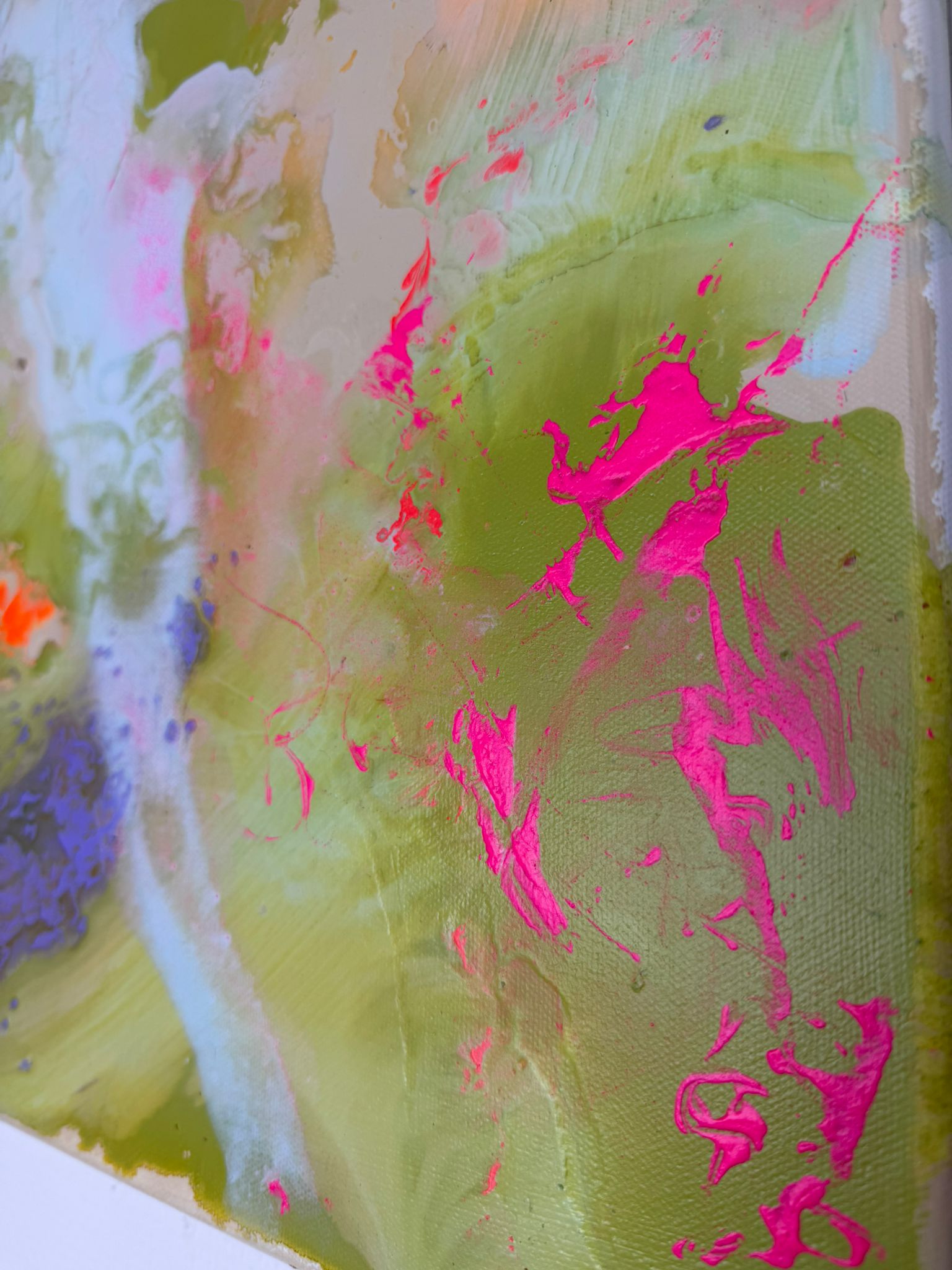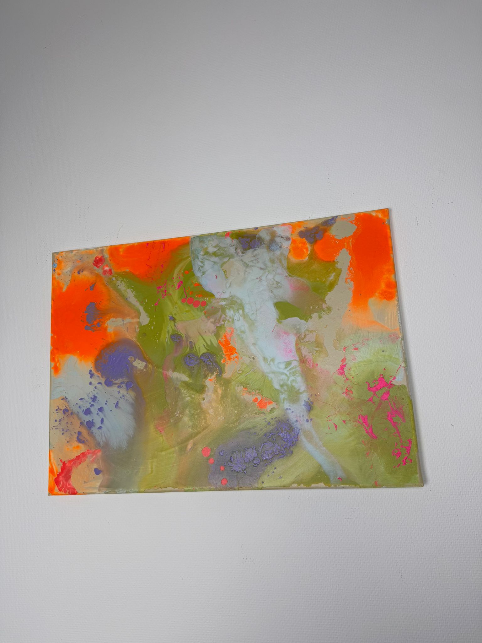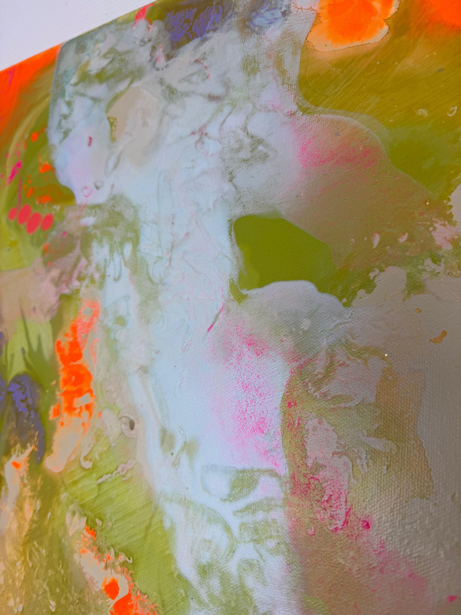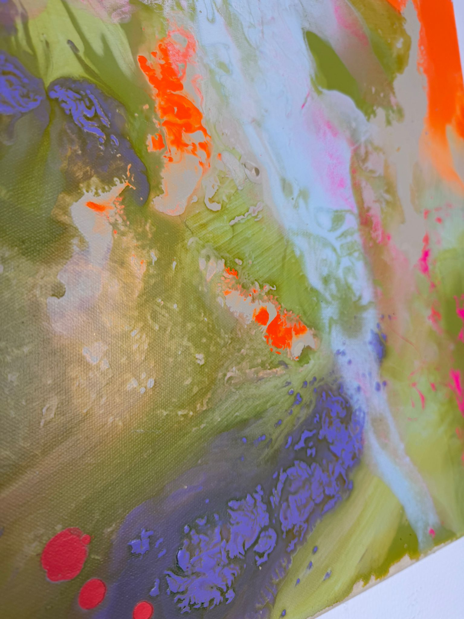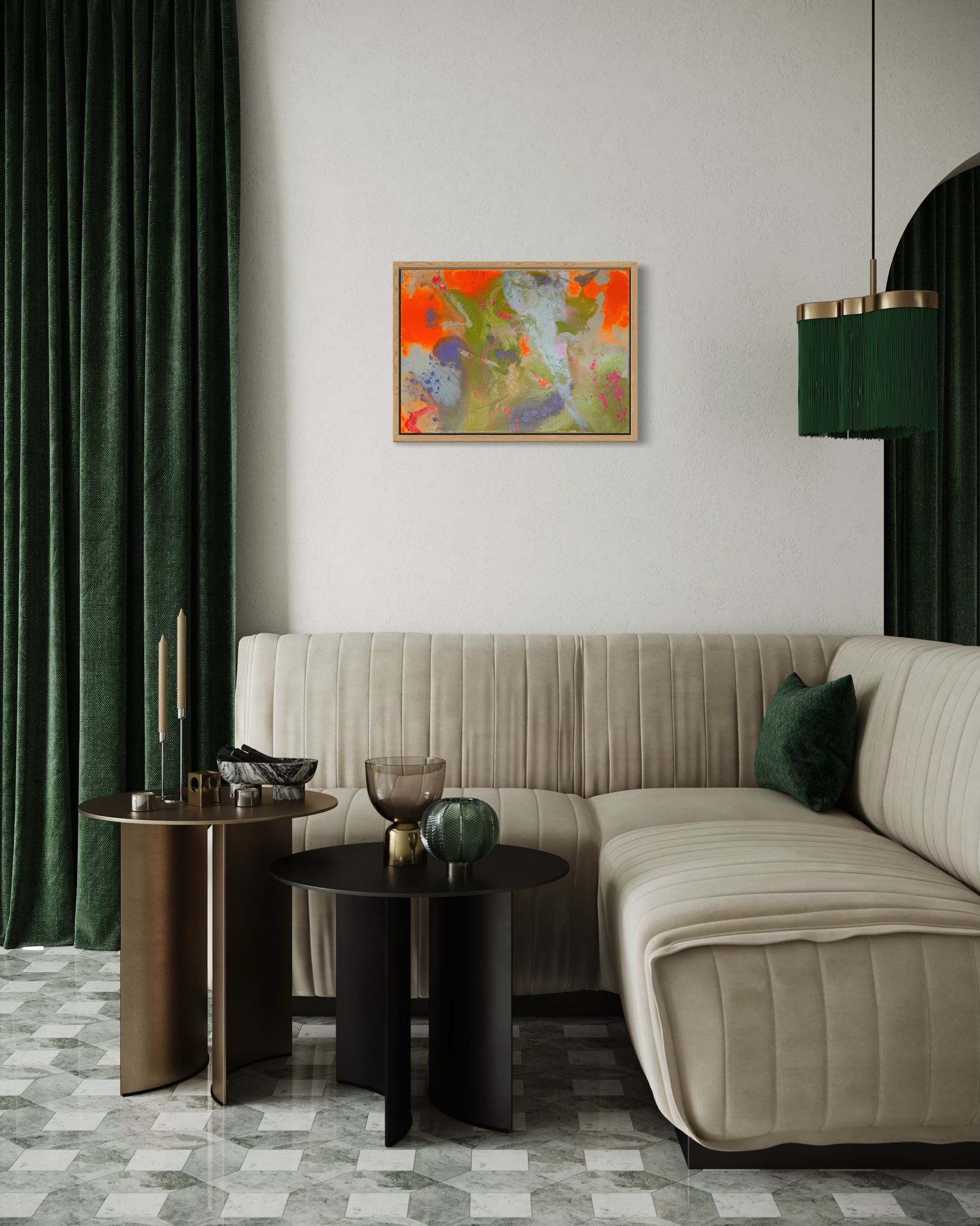 Leuchtende Orangetöne fließen über sanfte Grün- und Blauflächen und erzeugen eine Atmosphäre von Leichtigkeit und innerer Weite. Die Komposition wirkt wie ein innerer Zustand: ruhig, offen, getragen von Zuversicht. Farbspritzer und organische Übergänge erinnern daran, dass Freude nicht perfekt sein muss, um echt zu sein.