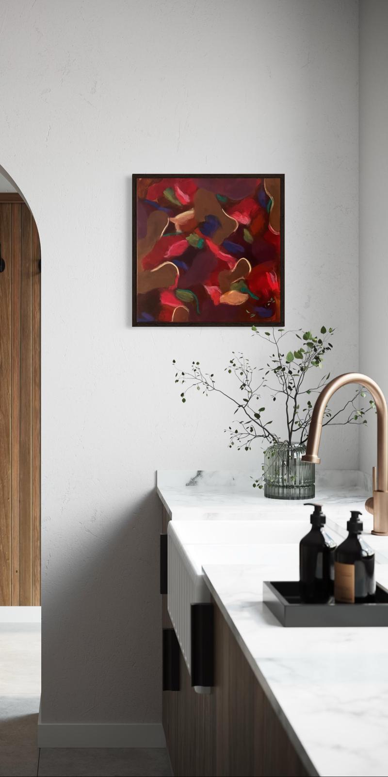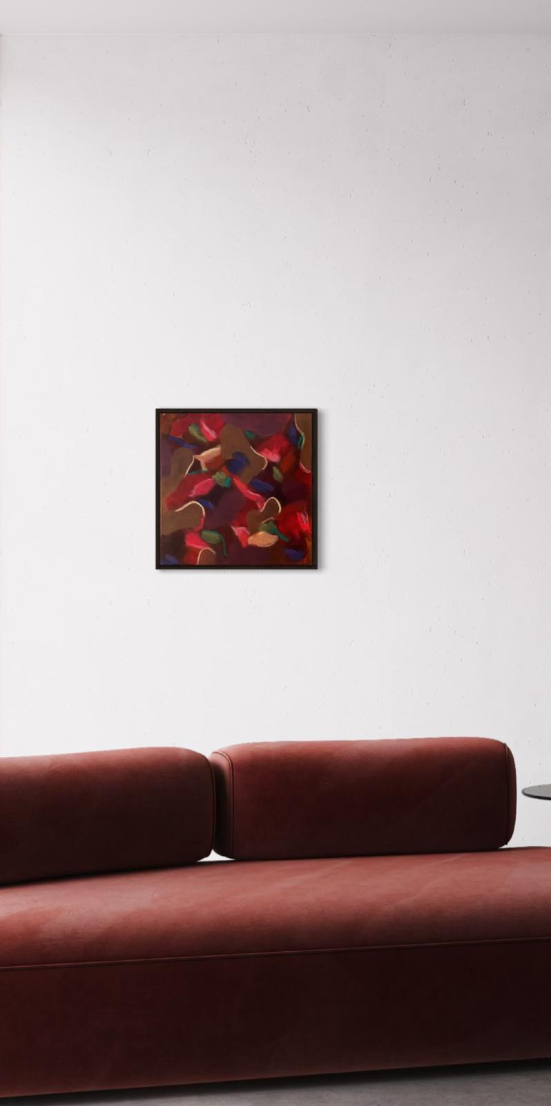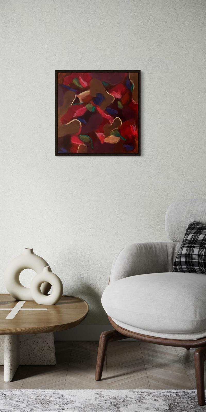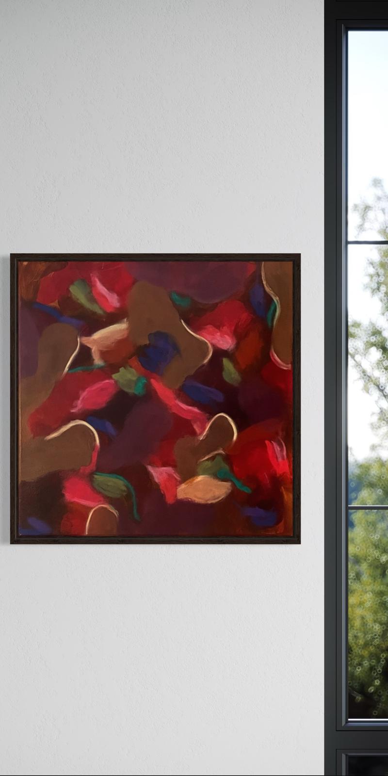 Mit satten Rottönen, warmen Braun, dunklen Beerennuancen und ruhigen Farbschatten erzählt das Bild von Transformation. Von Loslassen, Neubeginn und der Kraft, nicht sofort Antworten zu brauchen. Jeder Pinselstrich wirkt wie ein tiefer Atemzug – intuitiv, ehrlich, in sich ruhend.