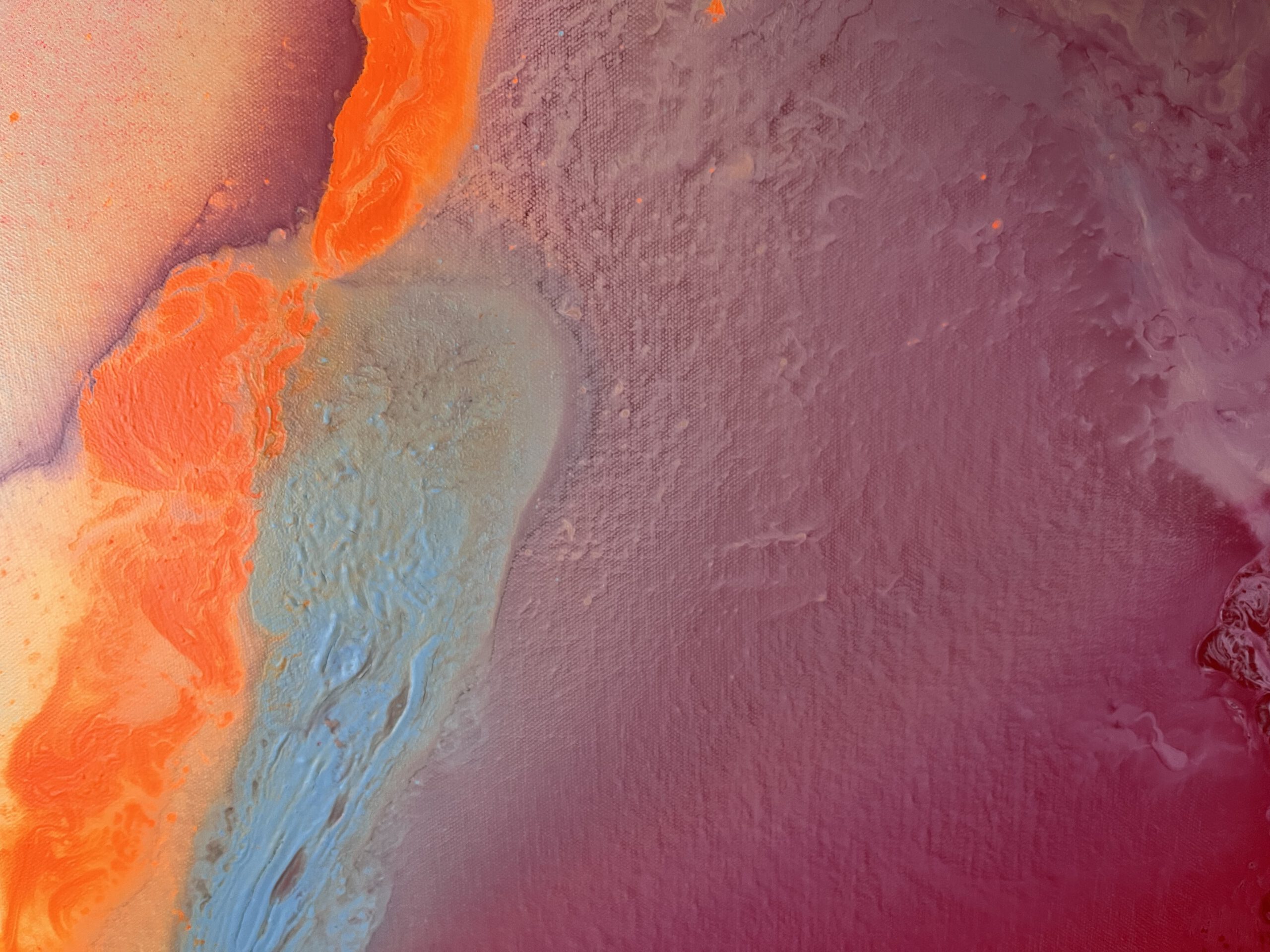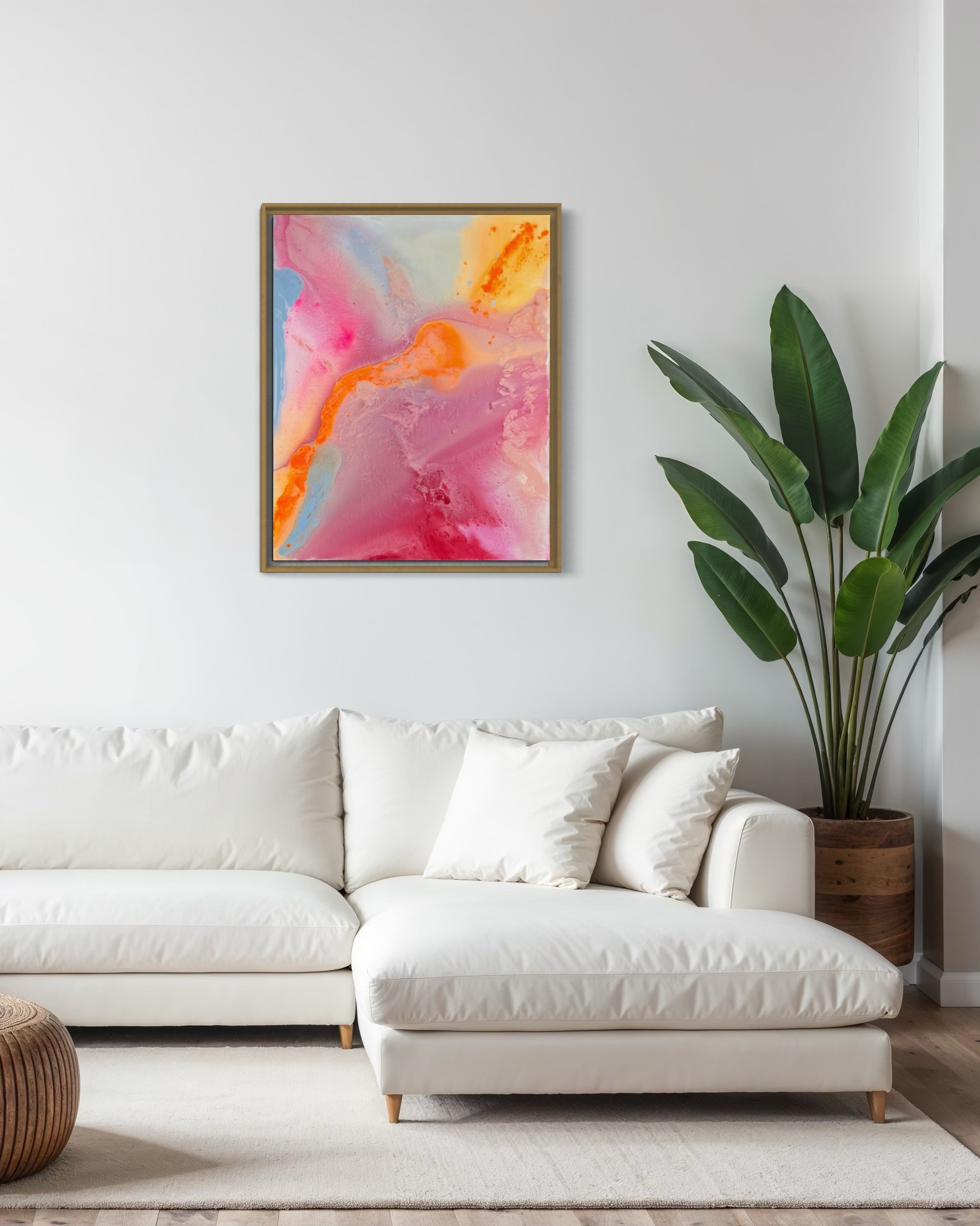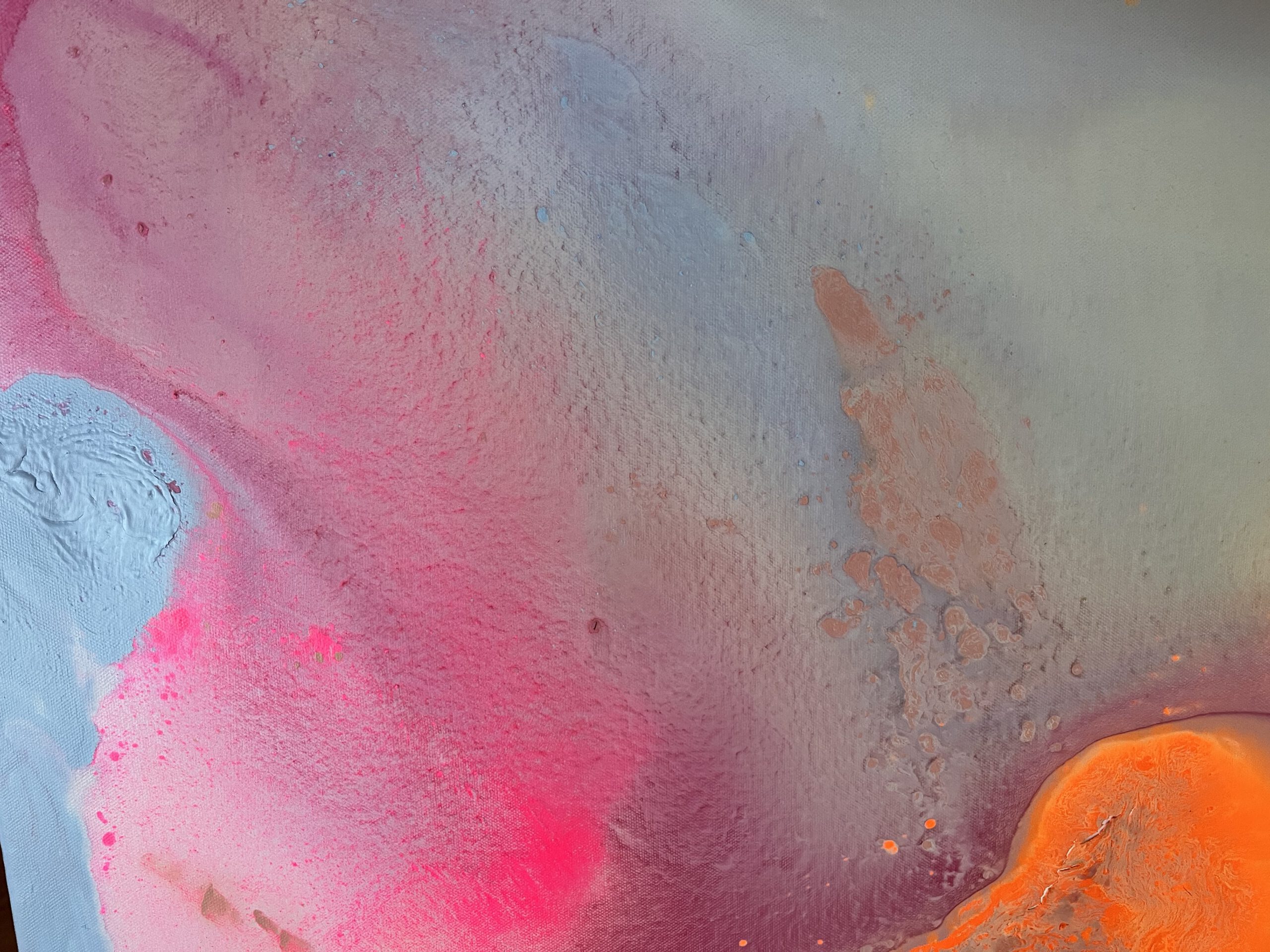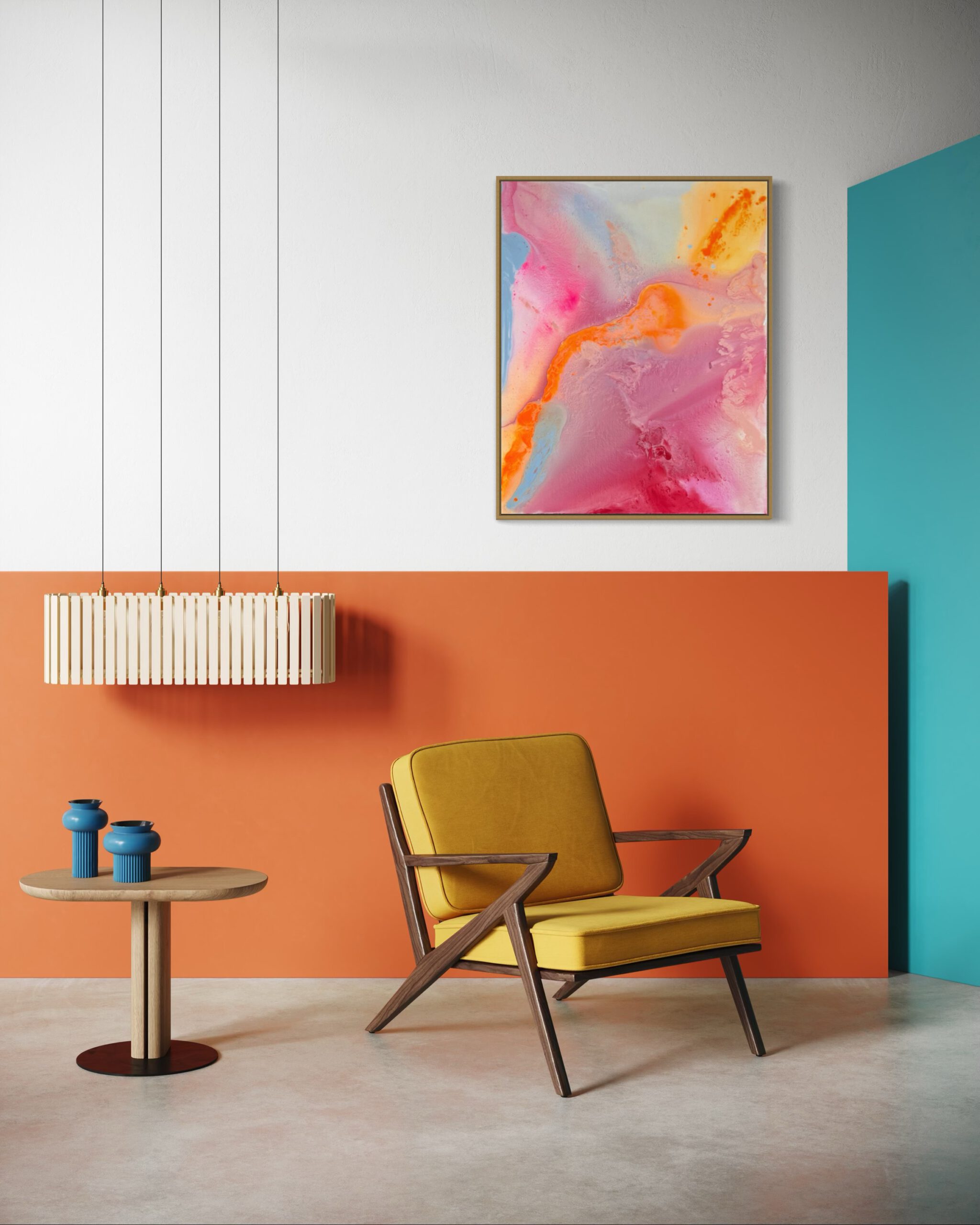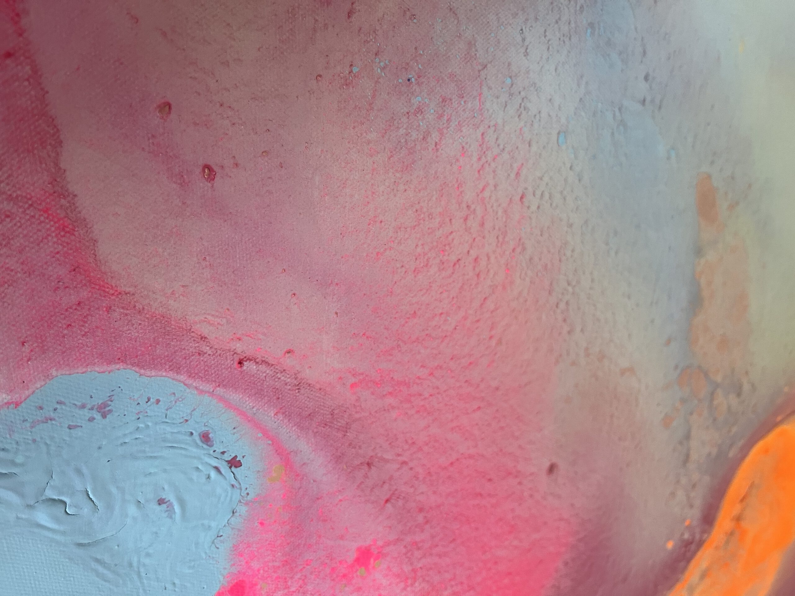 Sanftes Rosa, warmes Orange, sonniges Gelb und strahlendes Hellblau fließen harmonisch ineinander und erzeugen ein Gefühl von Leichtigkeit und Optimismus. Die energiegeladene Komposition wirkt wie ein Sonnenaufgang in Farben – ein visuelles „Alles ist möglich“.